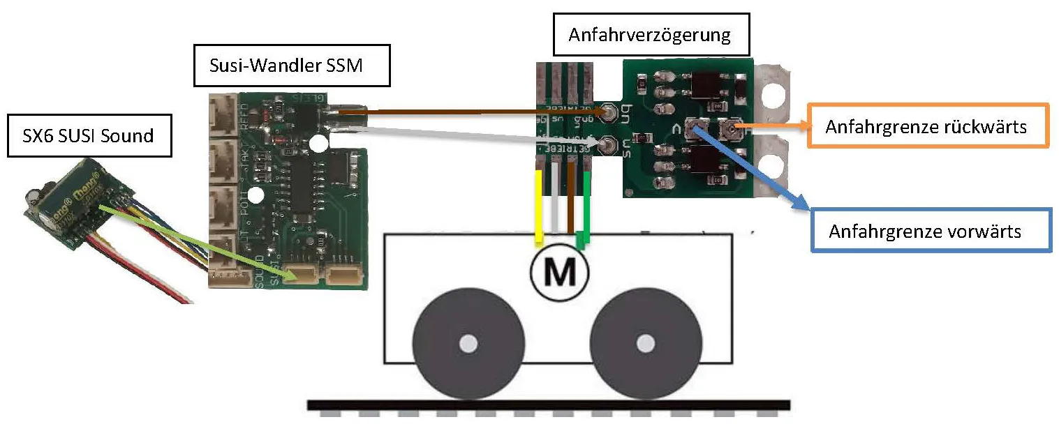 Nun benötigen wir das zweiadrige Kabel mit dem Flachstecker und verbinden den SUSI-Wandler mit der Anfahrverzögerung
