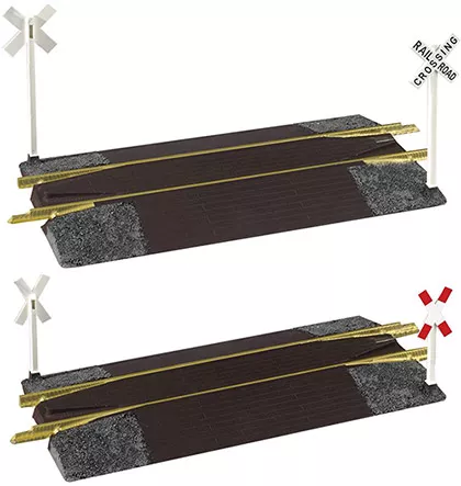 Formneuheit eines Bahnübergangs mit Aufgleisvorrichtung. Andreaskreuze nach deutschen und amerikanischen Vorbildern liegen bei.