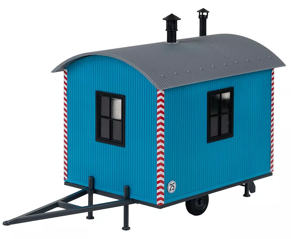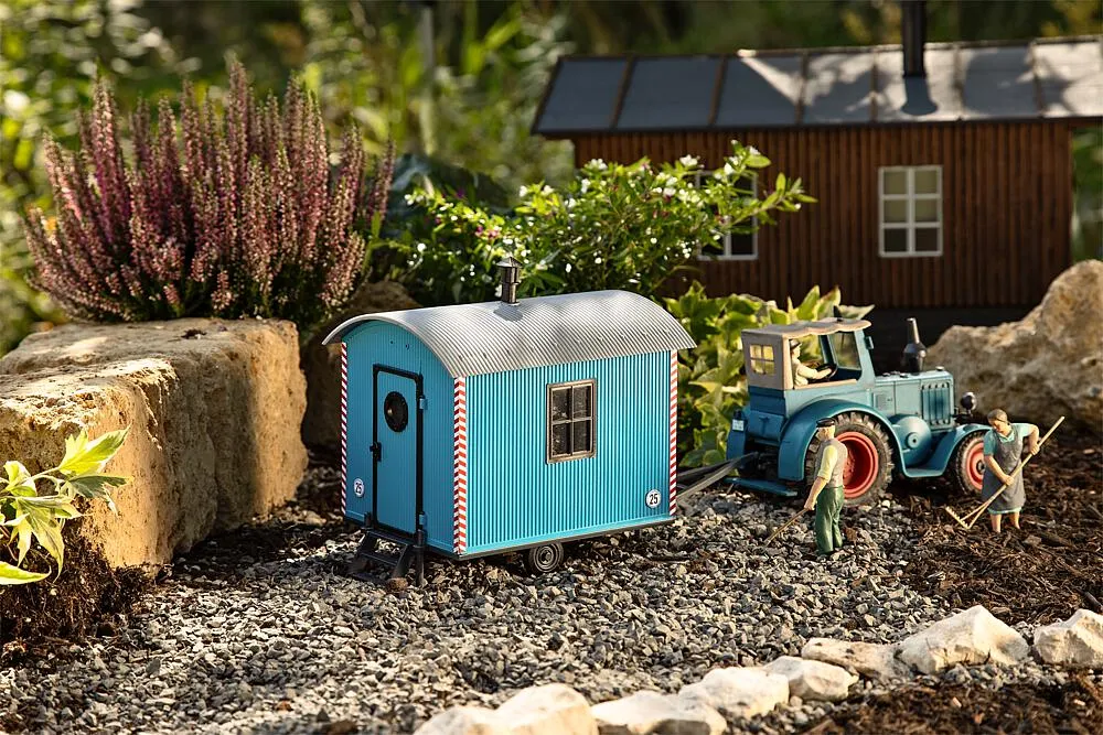 Ein charakteristischer Bauwagen mit einer blauen Blechfassade, grauem Dach mit Kaminrohr und Fenstern, der häufig auf Baustellen oder im landwirtschaftlichen Sektor eingesetzt wird. Seine Tür, geschmückt mit einem runden Fenster, kann geöffnet und geschlossen werden. Der Bauwagen verfügt über ein robustes Fahrgestell, authentische Räder und eine Deichsel, wodurch er kompatibel mit allen POLA G Fahrzeugen ist.