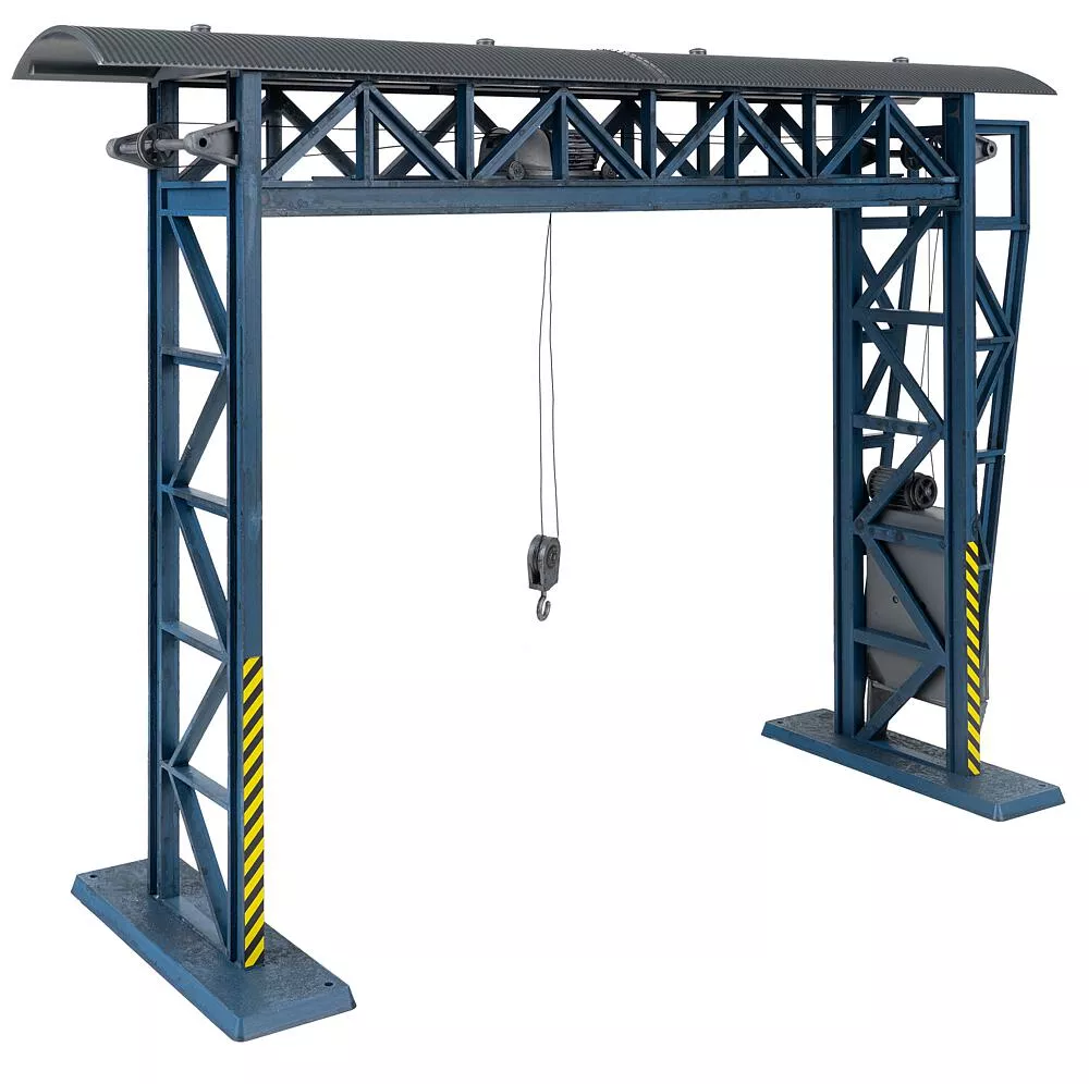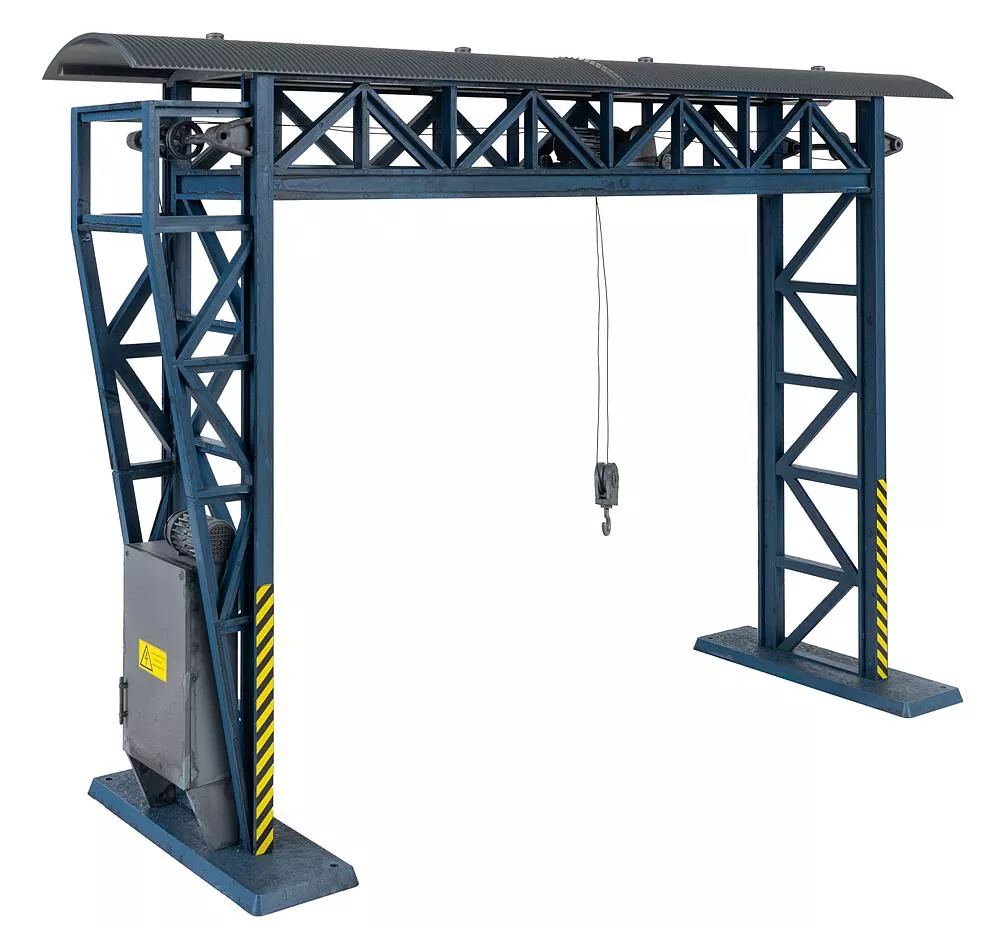 Der Bockkran ist ein bahntypisches Modell für das Heben und Verladen schwerer Lasten, geeignet für Bahnbetriebswerke und andere Bereiche, und überspannt zwei Gleise.