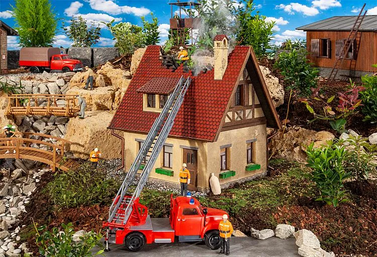 Das Einfamilienhaus kann mit einer realistischen Brandszene mit dichtem Qualm und loderndem Feuer ergänzt werden: