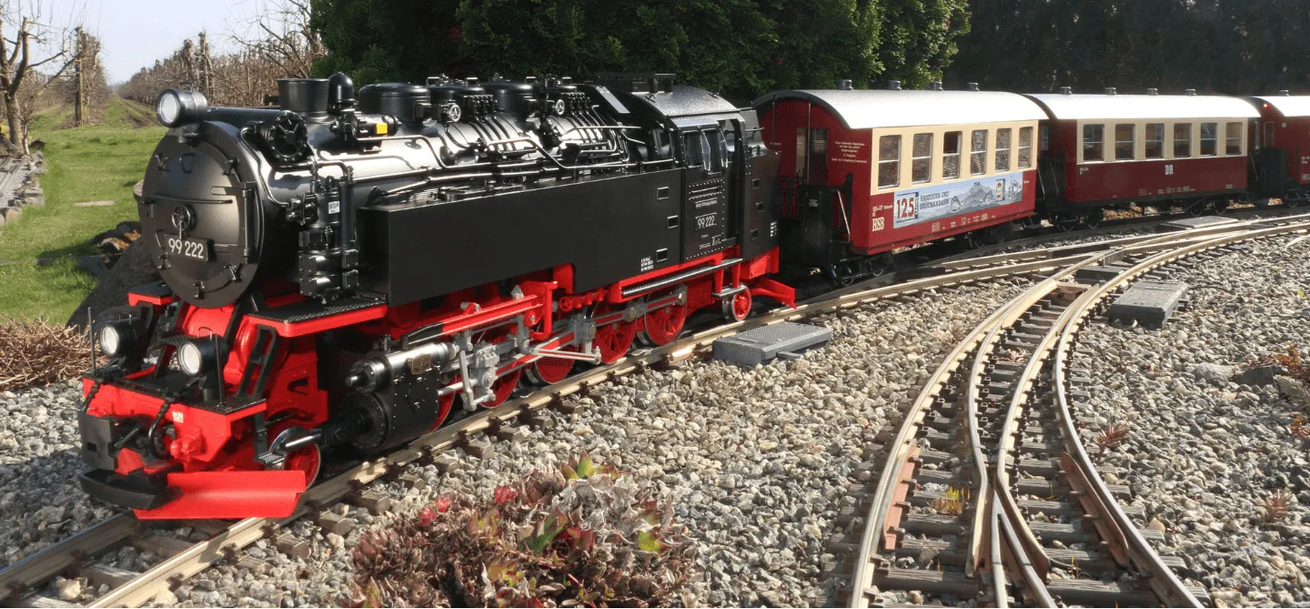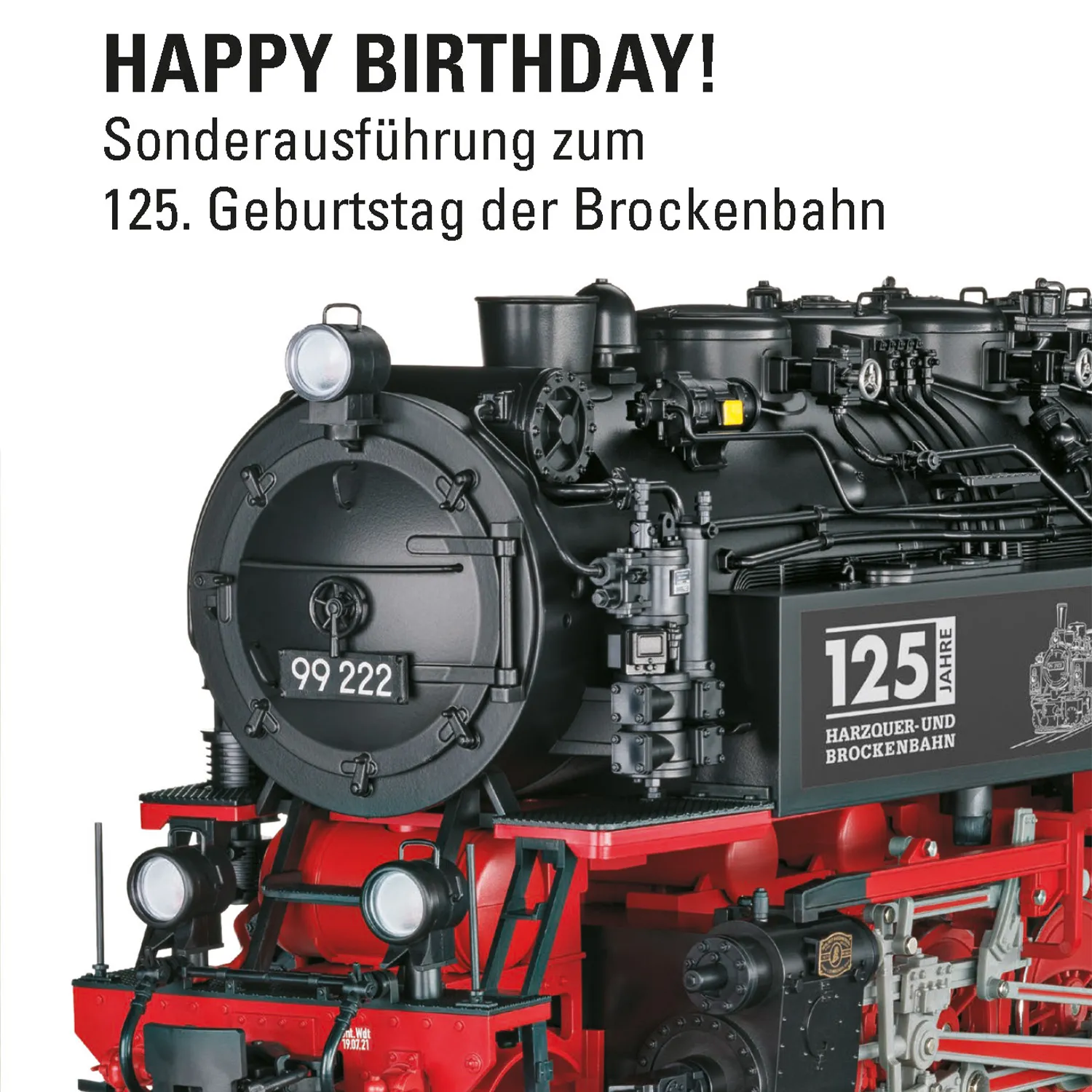 Die Schmalspurdampflok 99 222 der Harzer Schmalspurbahnen (HSB) ist heute noch im Einsatz und entspricht dabei dem Originalmodell. Sie trägt eine authentische Farbgebung und Beschriftung aus der Epoche VI. Die kraftvollen Motoren, die von kugelgelagerten Lagern angetrieben werden, sorgen dafür, dass alle fünf Treibradsätze in Bewegung bleiben. Die Lok ist mit einem mfx/DCC-Decoder ausgestattet, der zahlreiche Licht- und Soundfunktionen bietet, darunter ein wechselndes Spitzenlicht entsprechend der Fahrtrichtung, Führerstandsbeleuchtung und separat schaltbare Triebwerksbeleuchtung. Eine Pfeife und Glocke können durch Reedschalter ausgelöst werden, auch im Analogbetrieb. Ein Rauchgenerator ist eingebaut, der radsynchronen Dampfausstoß und Zylinderdampf erzeugt. Zahlreiche angesetzte Details verleihen der Lok einen realistischen Look, der komplett eingerichtete Führerstand sowie Türen sind sogar zu öffnen. Ein Beschriftungsbogen mit Nachbildungen der Plakate von den Sonderfahrten zum 125. Geburtstag der Brockenbahn liegt ebenfalls bei. Die Länge über Puffer beträgt 55 cm.