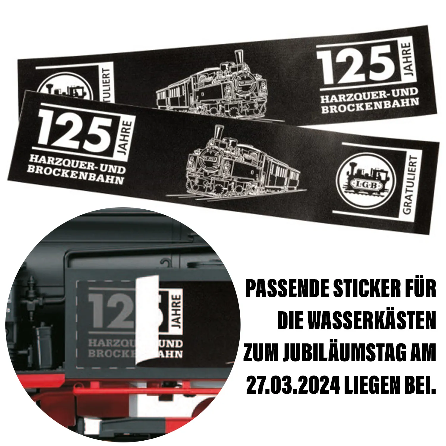 Sonderausführung zum 125. Geburtstag der BrockenbahnPassende Sticker für die Wasserkästen zum Jubiläumstag am 27.03.2024 liegen beiMit verschiedenen SoundfunktionenDurch Reedschalter auslösbare Pfeife und GlockeRadsynchroner Rauch-ausstoß im DigitalbetriebSpitzenlicht digital schaltbar