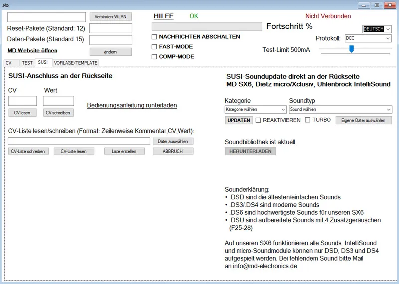 - SUSI-Test, Programmierung, Updates von Sounds (ML-Train SX6, Dietz micro, Uhlenbrock IntelliSound)