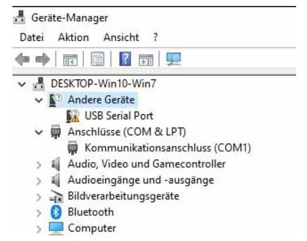 Öffnen Sie zuerst den Geräte-Manager. Falls keine Treiber installiert sind, finden Sie ein „USB Serial Port“ Gerät unter „Andere Geräte“. Erkennbar am gelben Dreieck, hier fehlen Treiber.