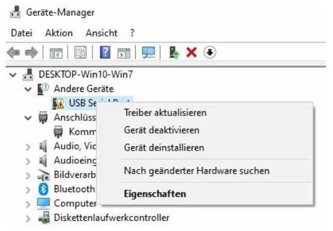 Klicken Sie mit „rechtsklick“ auf das „USB Serial Port“ und es öffnet sich ein Fenster mit Optionen. Klicken Sie dann auf „Treibersoftware aktualisieren“.