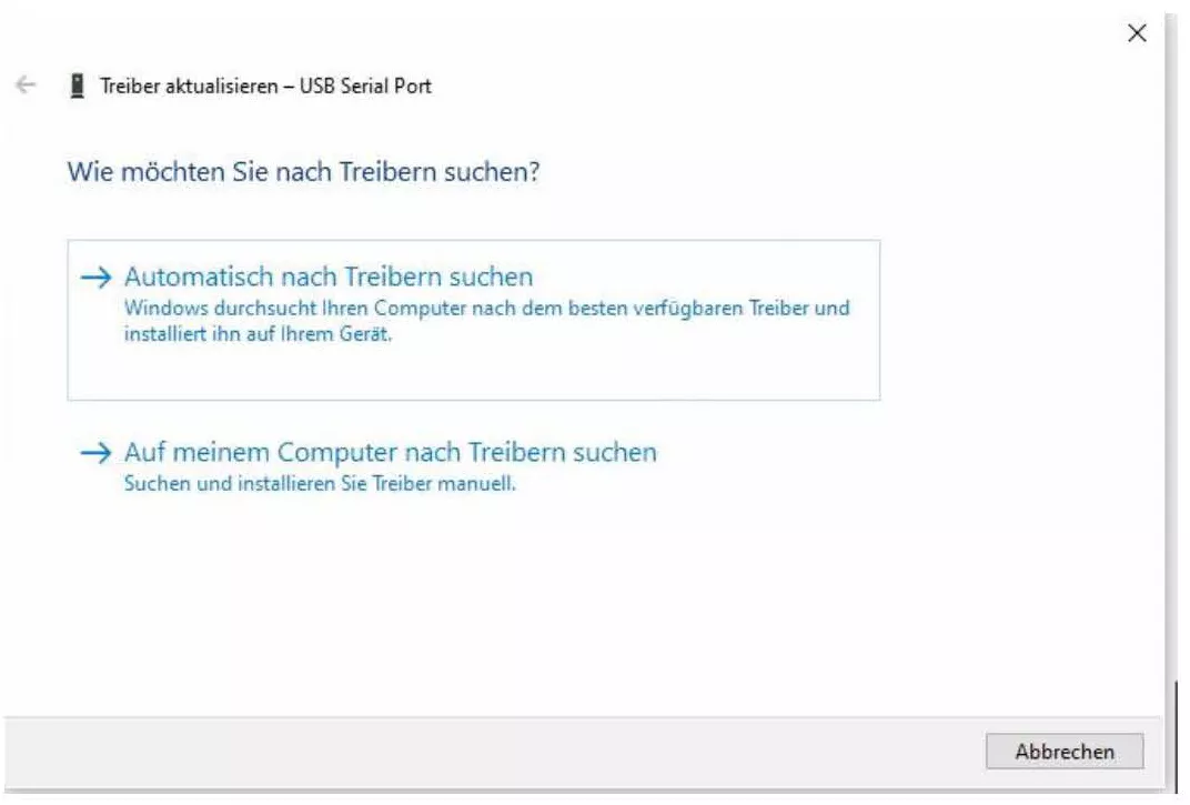 Nun öffnet sich ein neues Fenster. Sie können versuchen, „Automatisch nach Treibern suchen“ zu wählen. Wenn dies funktioniert sind Sie fertig und können das Gerät nun benutzen. Falls dies nicht zum Erfolg führt, laden Sie sich die Treiber auf unserer Website im Downloadbereich herunter. Diese müssen entpackt werden. Anschließend wählen Sie „Auf meinem Computer nach Treibern suchen“ aus und wählen den Ordner. Nach der Installation ist das Gerät unter „Anschlüsse (COM & LPT) zu finden.