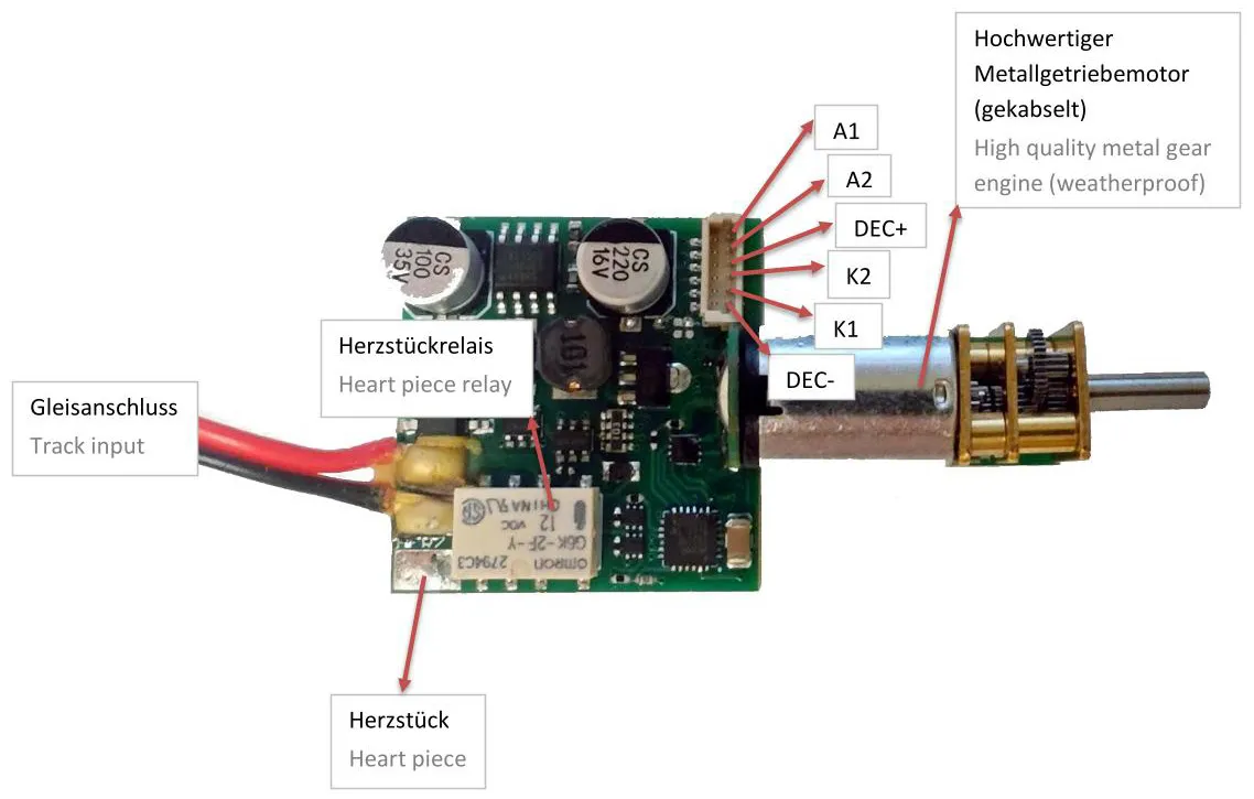 Der digitale Weichenantrieb DWA ist ein motorischer Antrieb mit integriertem Herzstückrelais und zwei verstärkten Funktionsausgängen. Er unterstützt DC, AC, DCC, Märklin-Motorola und mfx, ist voll NMRA-DCC-kompatibel, bietet RailCom und lässt sich über CVs, POM oder Register umfangreich konfigurieren. Die Endlagen erkennt der Antrieb selbstständig, eine manuelle Wegbegrenzung entfällt. Fahrweg-Geschwindigkeit, Aufschneidfunktion, definierte Startlage, Entkupplermodus und Funktionsmapping erlauben eine sehr fein abgestimmte Anpassung an das Anlagenkonzept. Das ABS-Gehäuse mit „Burggrabenprinzip“ schützt die Elektronik gegen Spritzwasser und Schmutz – ideal für Gartenbahnen.