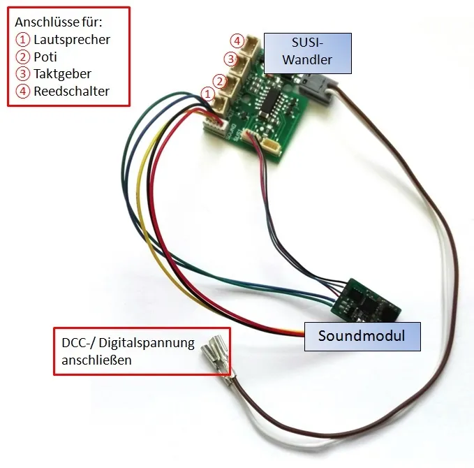 1x SUSI-Wandler, 1x Gleisspannungskabel, 1x SX6 Soundmodul