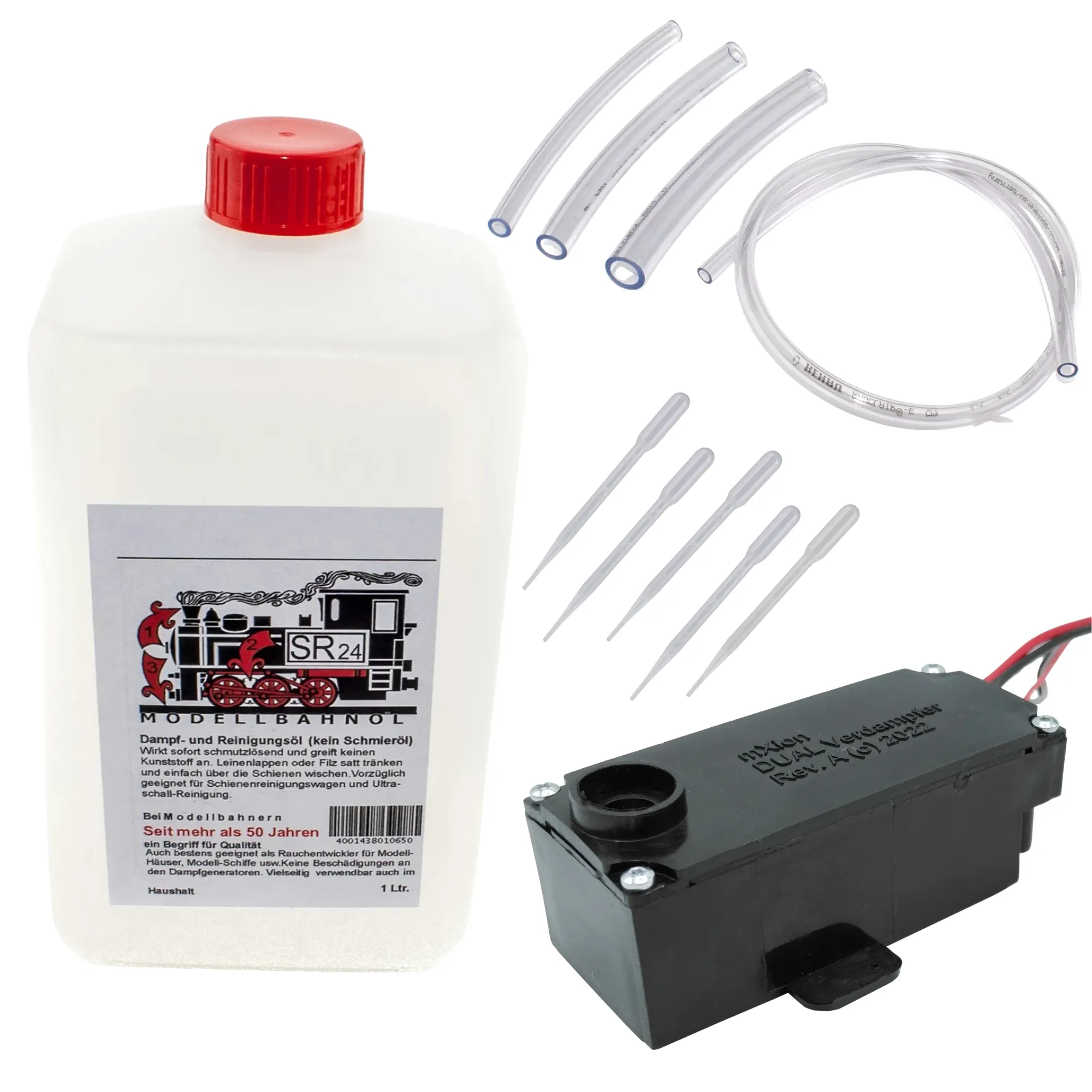 Komplettset für realistische Dampfeffekte: DUAL-Verdampfer mit getrenntem Schlot- und Zylinderdampf, gepulster CV-Steuerung und Lastregelung, plus abgestimmtes Zubehör für Montage, Betrieb und Pflege.