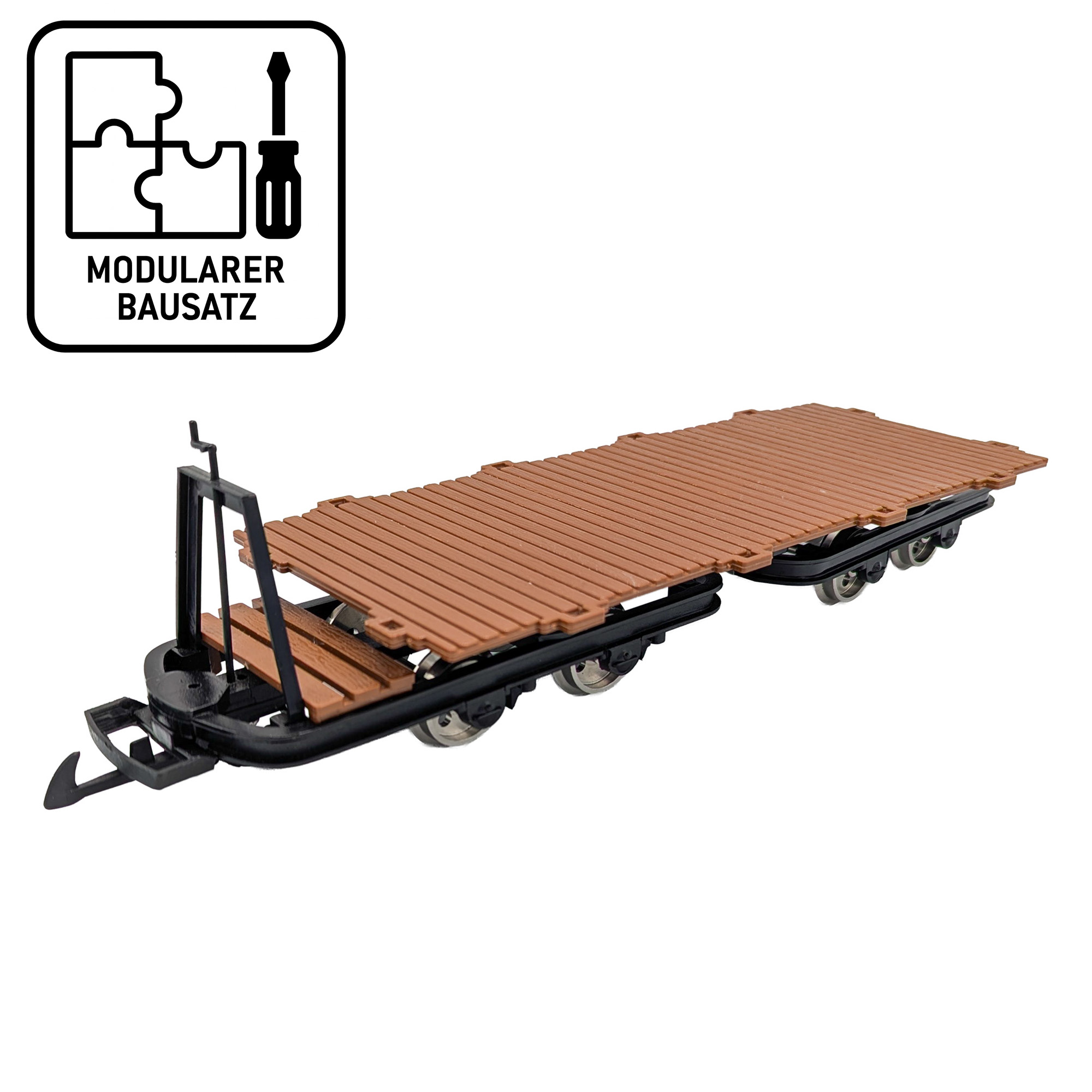 Torflorenaufsatz Braun: 88919471So entsteht ein zukunftssicherer Feldbahn-Flachwagen, der dank zweigeteilter Fahrwerksbasis und standardisierter Adapter in Minuten zwischen Kipploren-, Kastenloren- und Torflorenbetrieb wechselt – kurvengängig, stabil und vorbildnah.
