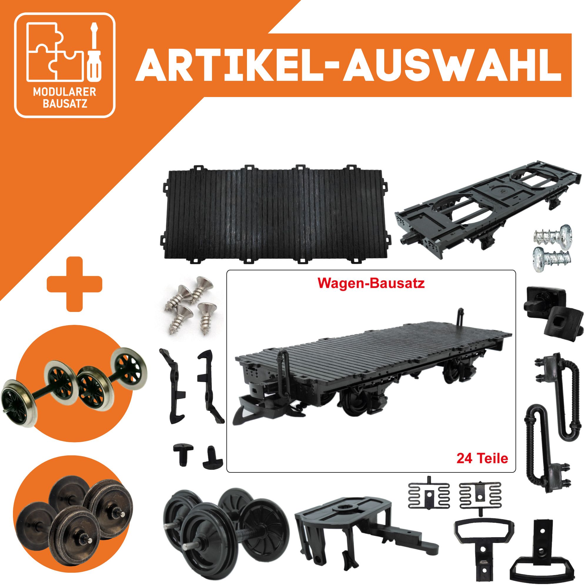 Der Flachwagen in Schwarz wird als präziser Spur-G Bausatz geliefert. Ein verwindungsarmer Plattformrahmen, passgenaue Steck-/Schraubverbindungen und lösbare Komponenten ermöglichen zügige Montage, stabile Verbindungen und ruhige Laufeigenschaften im täglichen Anlagenbetrieb.