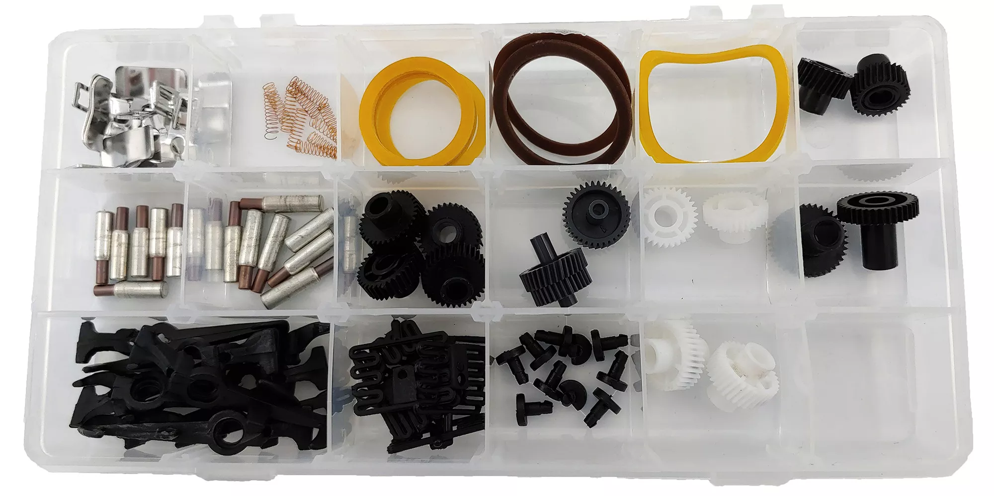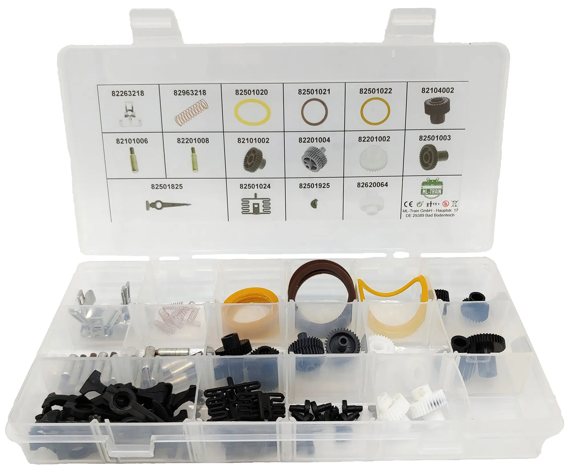 16x Schleifkohlen, 14x Haftreifen, 14x Zahnrad, 10x Schleifkontakt, 10x Feder, 10x Kupplungshaken, 10x Kupplungsstift, 8x Kupplungsfeder, 1x Kunststoff-Sortierbox, 1x Beschriftungs-Aufkleber für die Deckelinnenseite