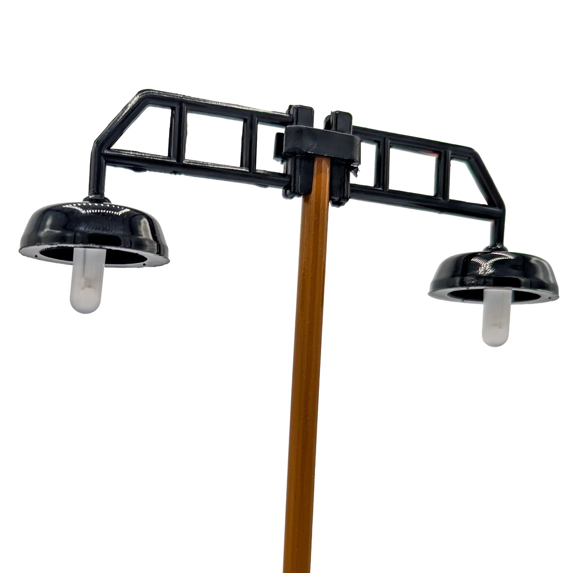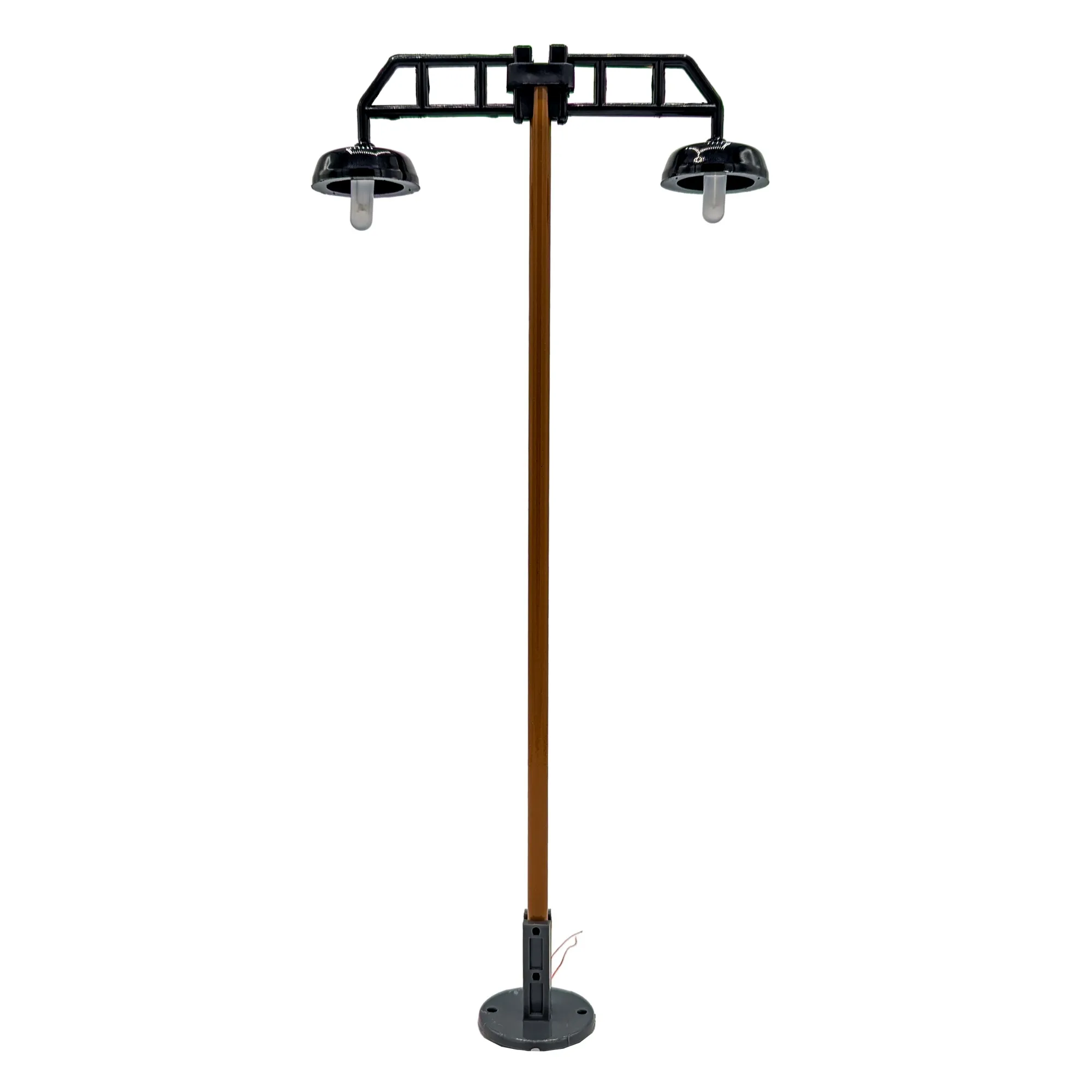 Die zweiflam­mige Gitterarmkonstruktion entspricht dem typischen Erscheinungsbild klassischer Bahnsteigbeleuchtung – ideal für detailreiche Modelle.