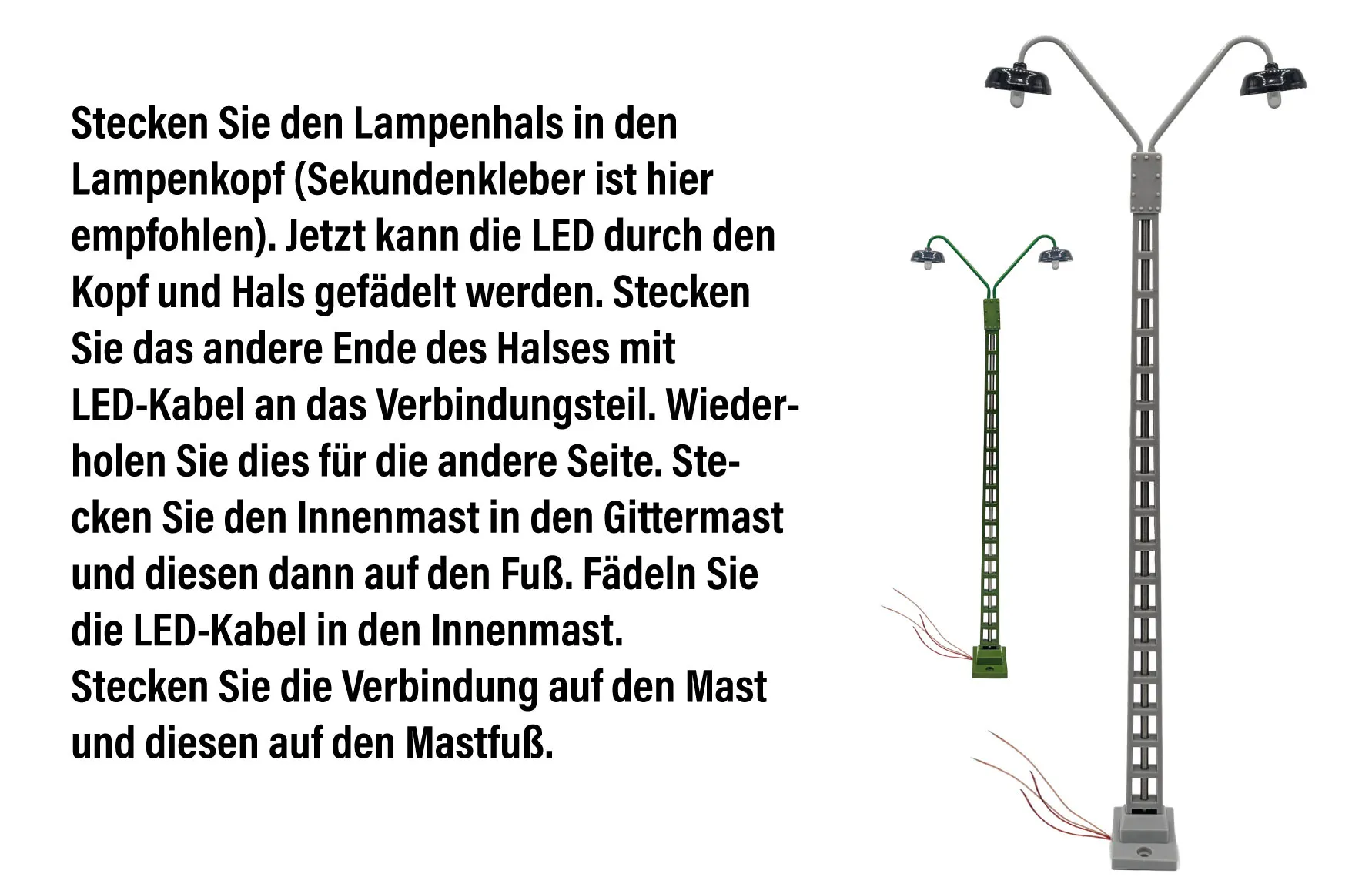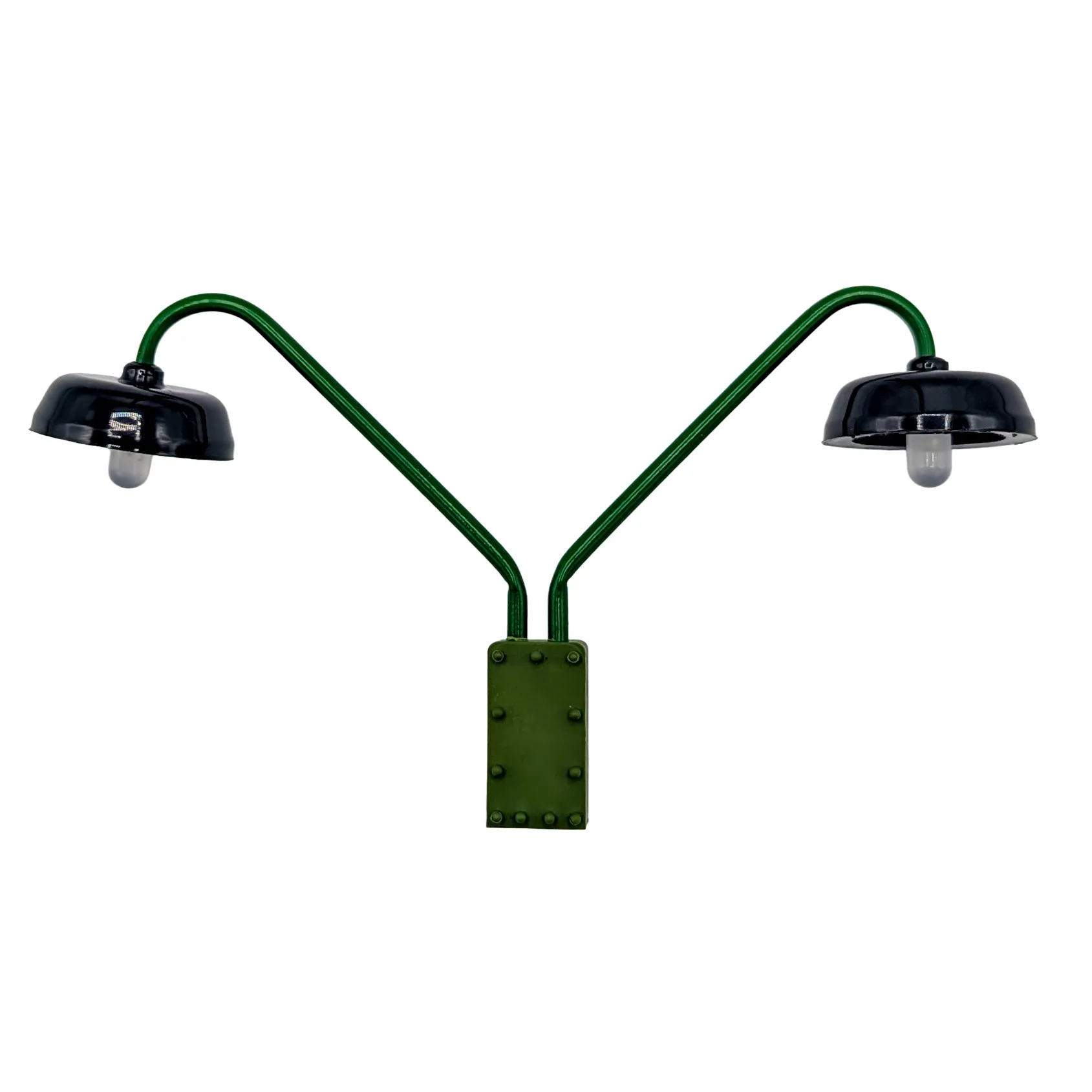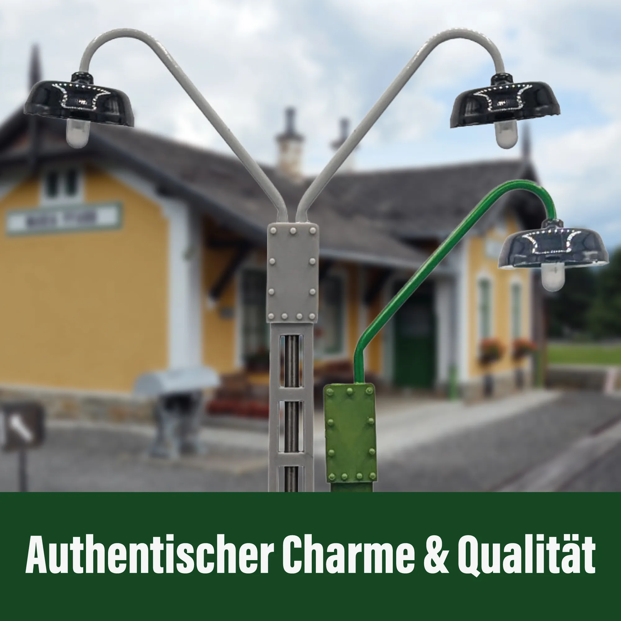 Mit ihrem dunkelgrünen Finish und dem doppelseitigen Aufbau verkörpert diese Gittermastlampe das klassische Erscheinungsbild historischer Bahnleuchten. Detailtreue und hochwertige Materialien machen sie zu einem Blickfang jeder realistischen Modelllandschaft.