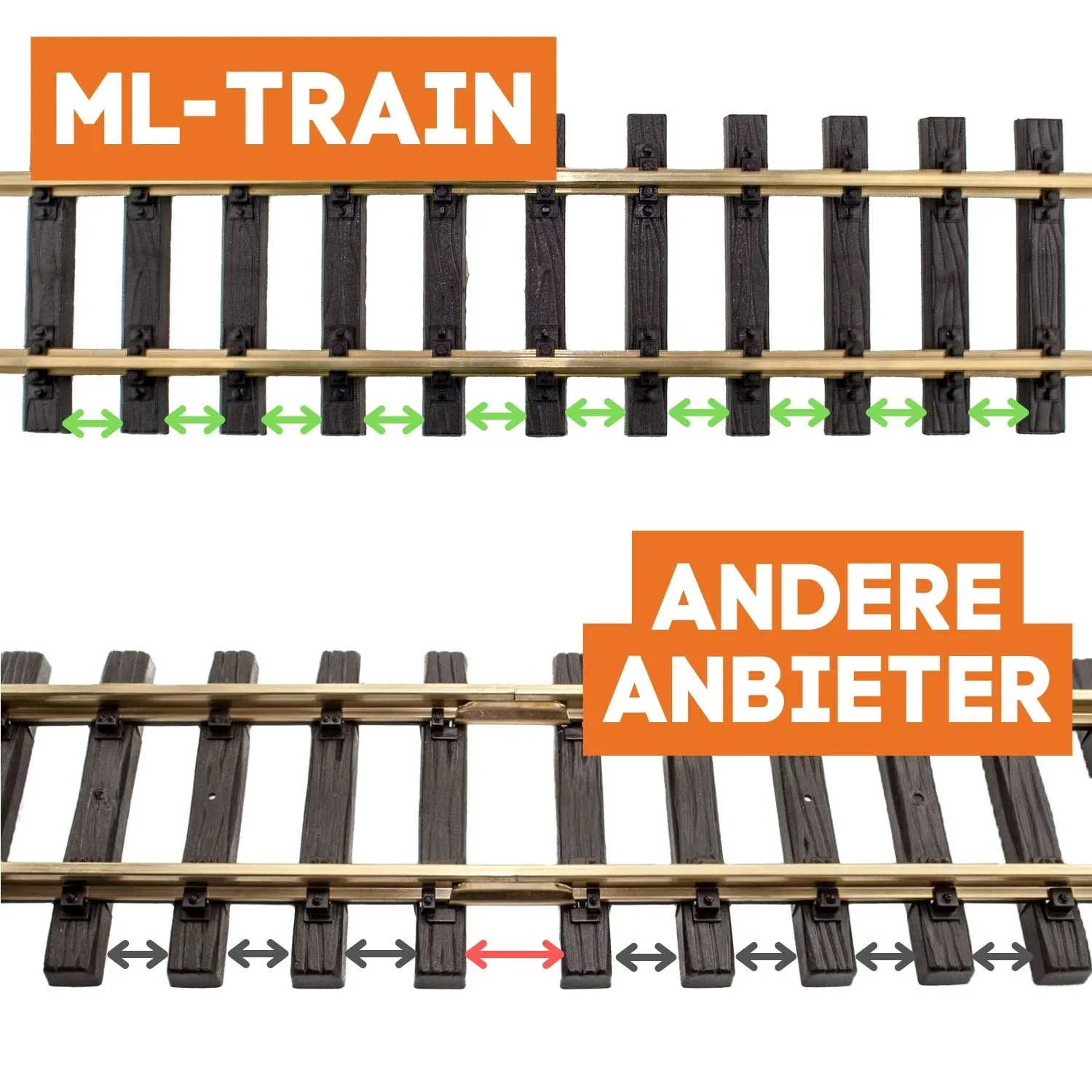 Die Kombination aus ML-Train Gleisen und Verbindern schafft extrem stabile Übergänge an den Stoßstellen, verhindert Kontaktflackern und reduziert Zugstopps, wodurch lange Fahrstrecken zuverlässig befahren werden können.