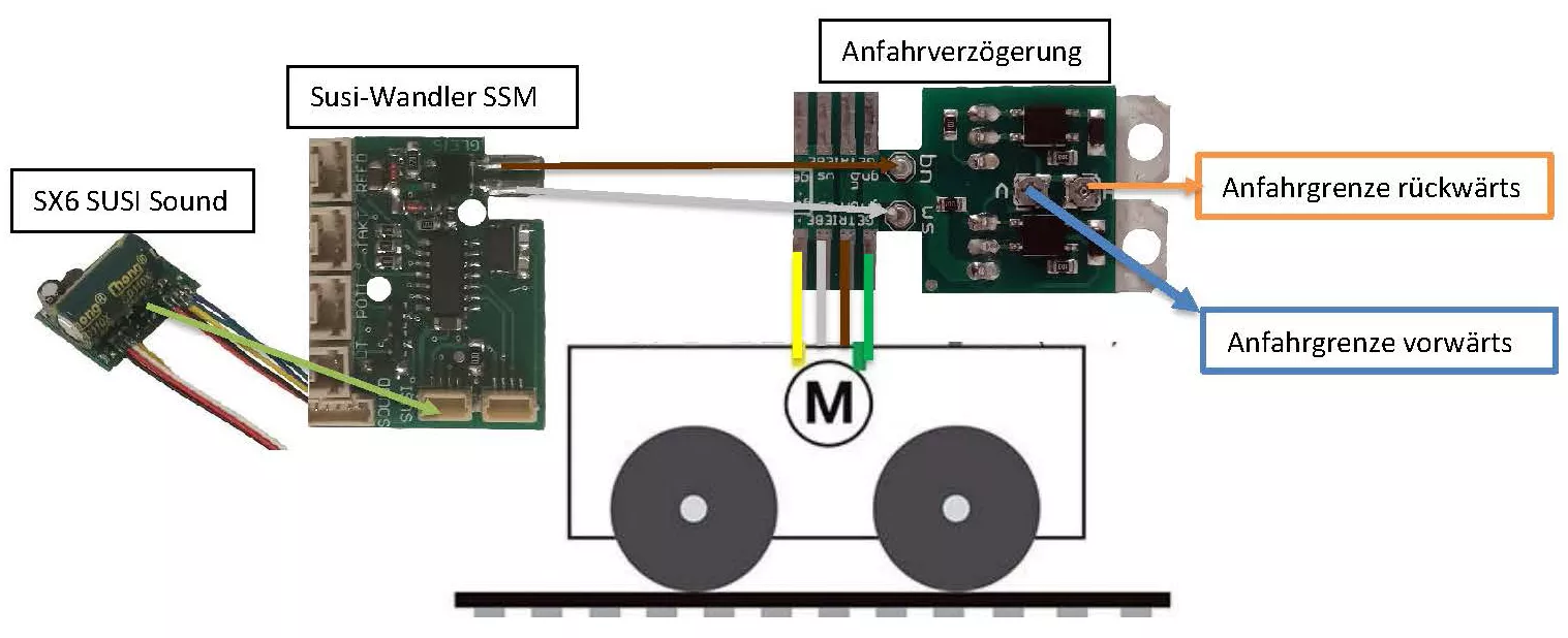 Bei alten Getrieben mit 3 Kabeln können diese direkt an die Anfahrverzögerung angeschlossen werden. Bei 4 poligen Getrieben wird auf der Anfahrverzögerung automatisch das gelbe mit dem weißen Kabel gebrückt, sprich einseitig Motor mit Gleis verbunden. Lediglich 2 polige Getriebe müssen so umgebaut werden, dass mindestens 1 Motoranschluss vom Gleis separiert wird.