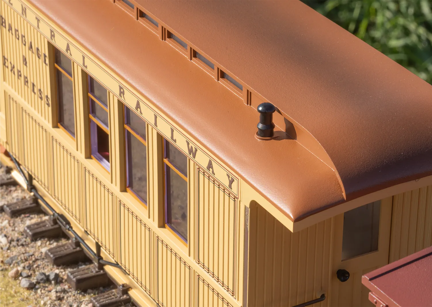 Dieses Modell repräsentiert einen charakteristischen amerikanischen Oldtimer-Halbgepäckwagen im Stil der Nevada Central Railroad, der damals bis in die 1930er-Jahre im Einsatz war. Es wurde in originalgetreuer Farbgebung und Beschriftung der Epoche II gestaltet. Das Modell verfügt über Türen, die geöffnet werden können, sowie eine vollständige Inneneinrichtung. Die Radsätze sind aus Metall gefertigt. Länge 49 cm.