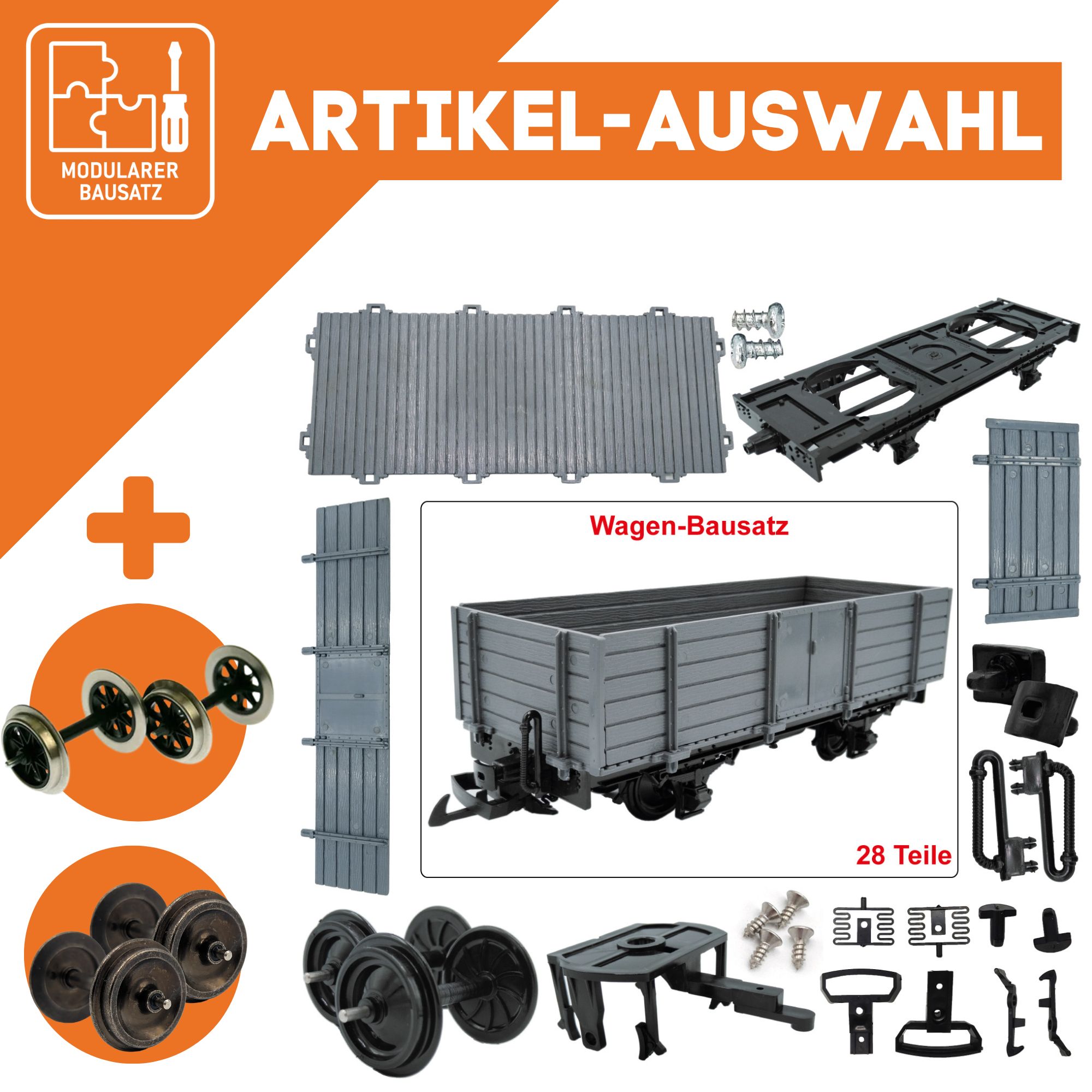 Grauer Hochbordwagen als Spur-G Bausatz mit robustem Rahmen, modularer Ausführung und Varianten mit unterschiedlichen Radsätzen.