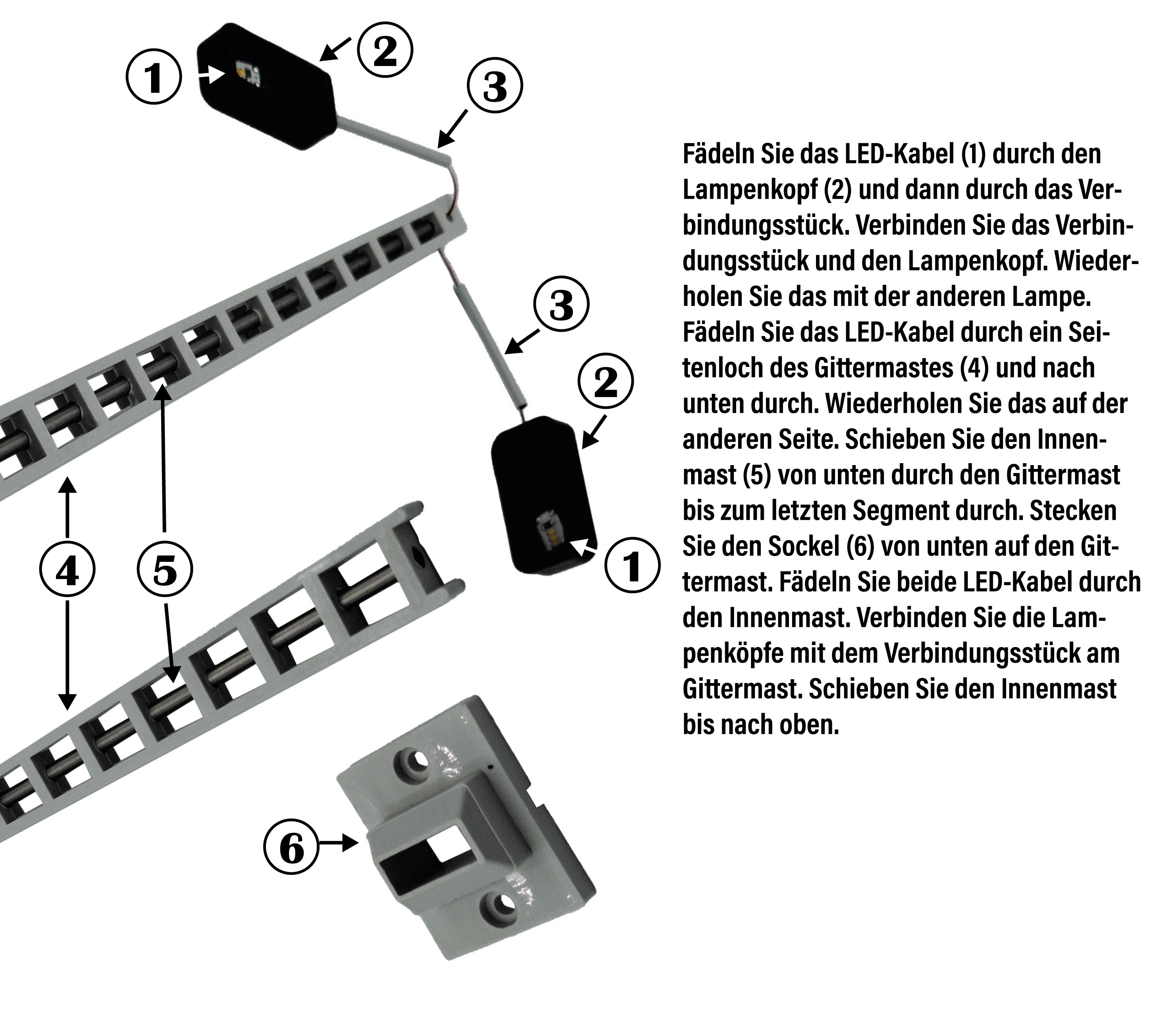 Sockel, Mast und Gehäuse bestehen aus langlebigen Materialien, die sowohl im Innen- als auch im Außeneinsatz zuverlässige Stabilität und Funktion bieten. Vorbildgerechte Optik