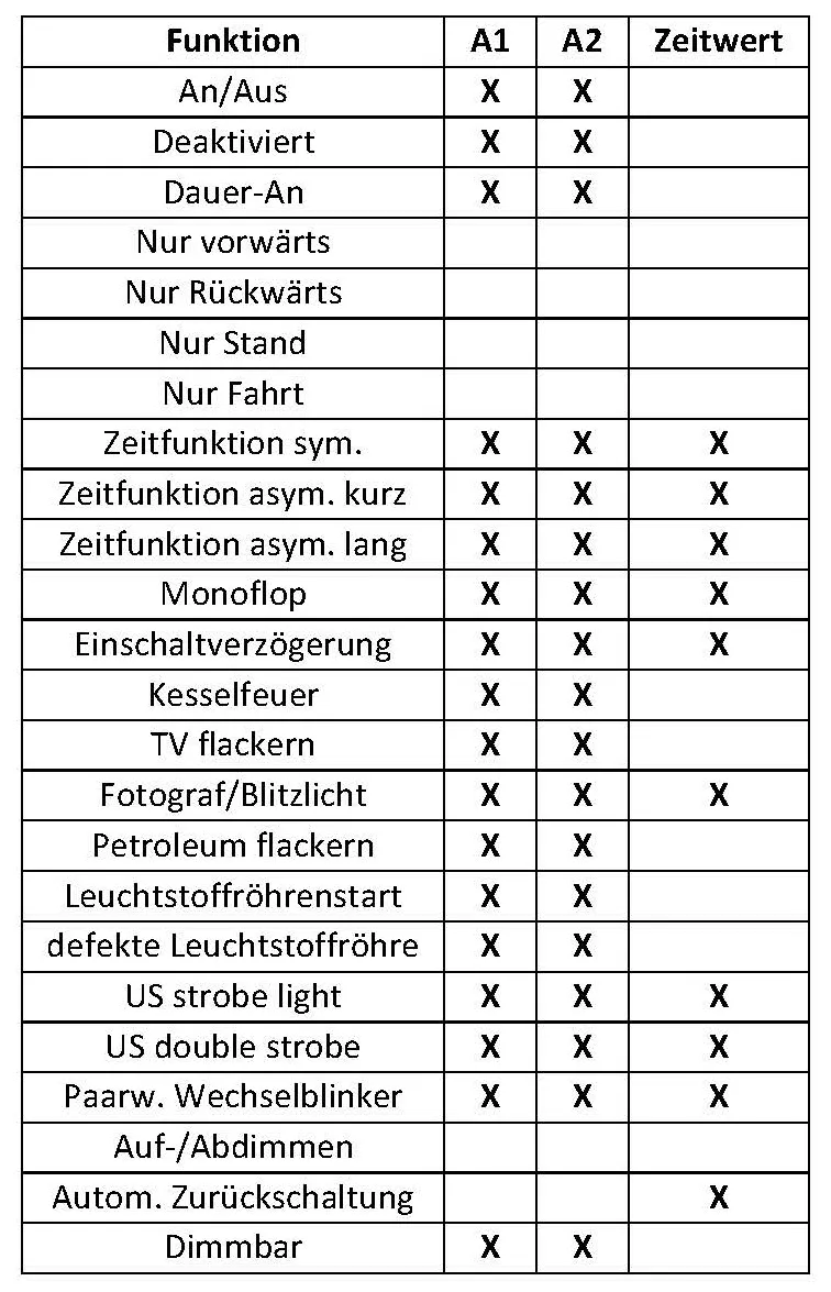 LGB® RhB Salonwagen/Pullmann (3x65x)LGB® RhB Gourmino (3x52x)LGB® US Streamliner (3x57x und 3x59x)2 verstärkte FunktionsausgängeIntegrierter, starker 5 V GeneratorZufallsgenerator (z. B. Toilettenlicht)Bedingungen (vorwärts, rückwärts, etc.)Viele Sonder- und Zeitfunktionen einstellbarFunktionsausgänge dimmbarResetfunktionen für alle CVsSehr einfaches Funktionsmapping28 Funktiontasten adressierbar, 10239 Lokadressen, 14, 28, 128 Fahrstufen (automatisch)Vielfältige Programmiermöglichkeiten (Bitweise, CV, POM)Keine Last bei Programmierung erforderlichAuch per Weichenadresse schaltbar (ab V. 1.1)