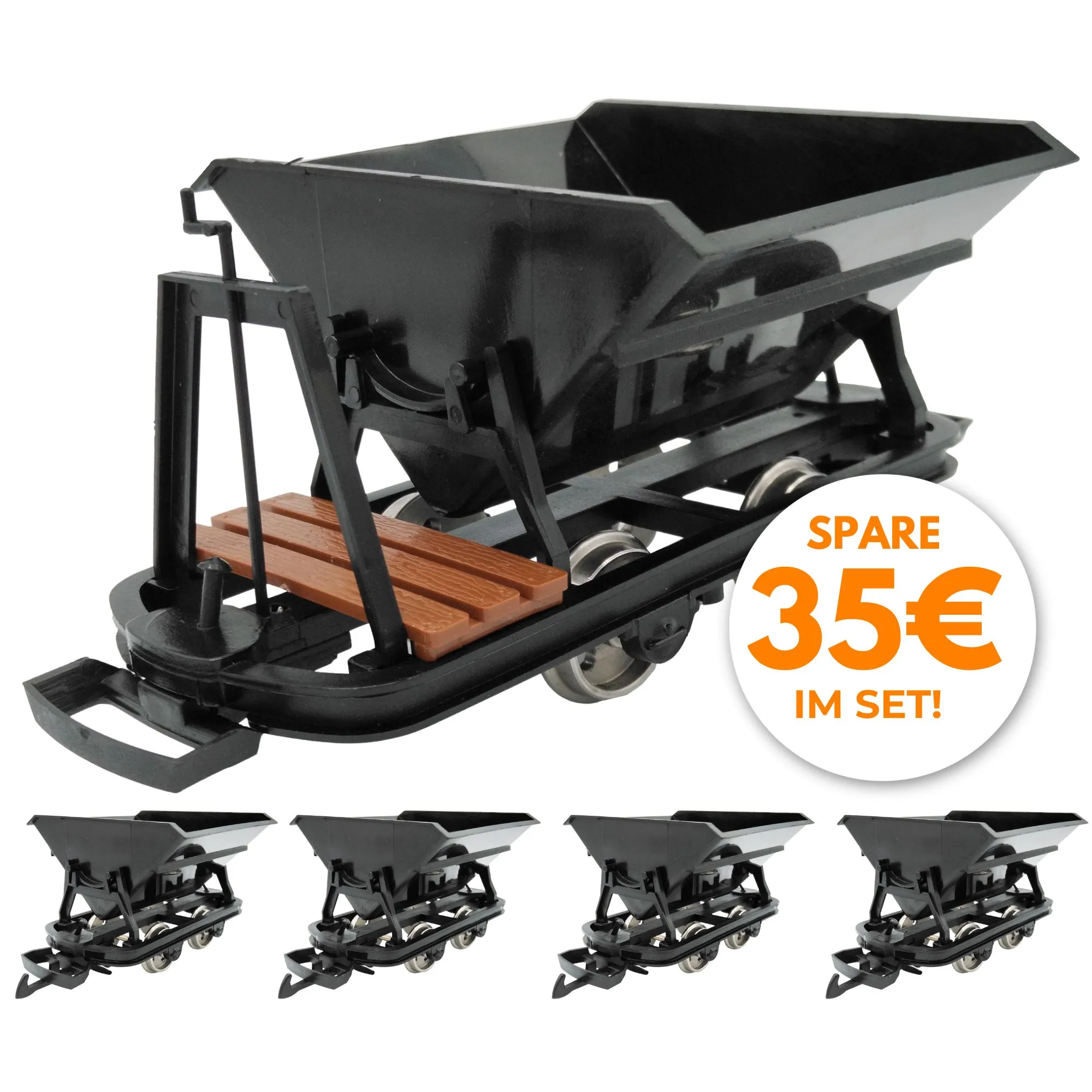 5er-Set schwarzer Kipploren für Spur G: vier Wagen für Schüttgut plus eine mit Bremserbühne. Robuste HDPE-Bausätze mit Edelstahl-Radsätzen einfacher Schraubaufbau Kupplungen und Ketten liegen mit bei.