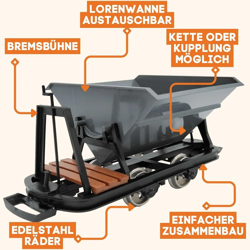 Kompletter Lieferumfang für realistische Verbindungen: Im Set sind Kupplungen und Ketten enthalten, die eine einfache und realistische Verbindung mit anderen Wagen der Feldbahnanlage ermöglichen, sodass Sie Ihre Modellbahn vielseitig und authentisch gestalten können.