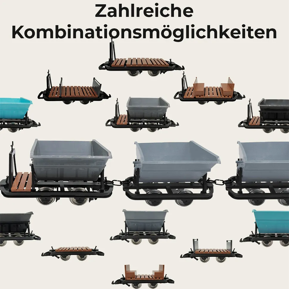 Nahtlose Kombination für Realismus: Kombinieren Sie diese Wagen mühelos mit der Kipplore, um einen vielfältigen und realistischen Feldbahnzug zu erstellen, der Ihre Anlage bereichert.