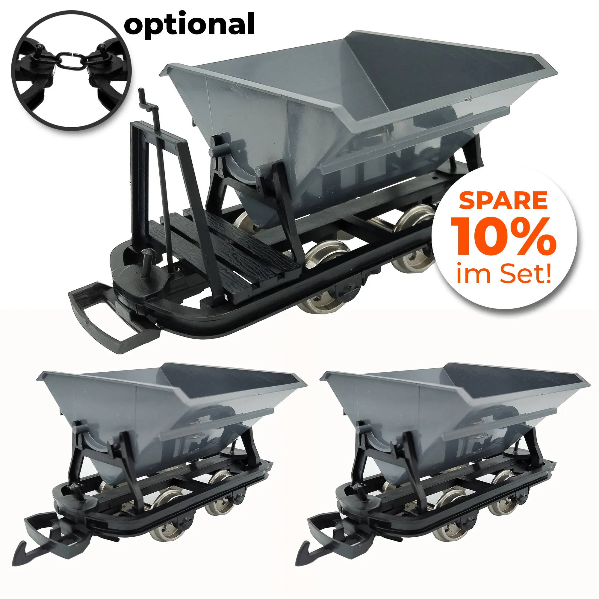Vielseitiges Set: Das Set enthält drei Kipploren (zwei ohne Bremserbühne, eine mit Bremserbühne), die für eine abwechslungsreiche und realistische Darstellung Ihrer Modellbahn sorgen.