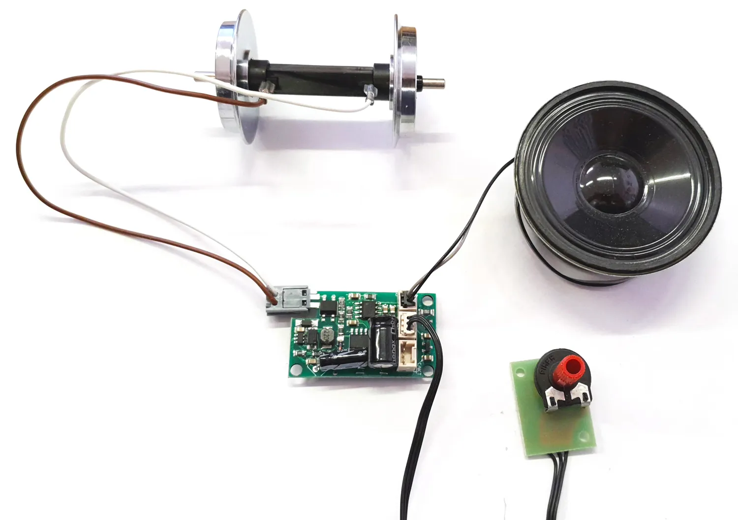 84004591 in die Lok oder den Wagen kleben. An das Modul kann ein Taktgeber (oder per Simulation), ein Poti (oder über CV einstellbare Lautstärke) und der Lautsprecher (8 Ohm) einfach eingesteckt werden - Plug&Play.