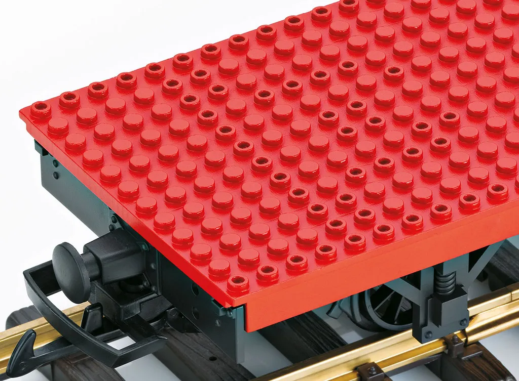 Modell eines zweiachsigen Flachwagens. Der Wagenboden ist mit den üblichen Klemmnoppen versehen, so dass verschiedenste Aufbauten mit Bausteinen anderer namhafter Hersteller möglich sind. Länge über Puffer 26 cm.