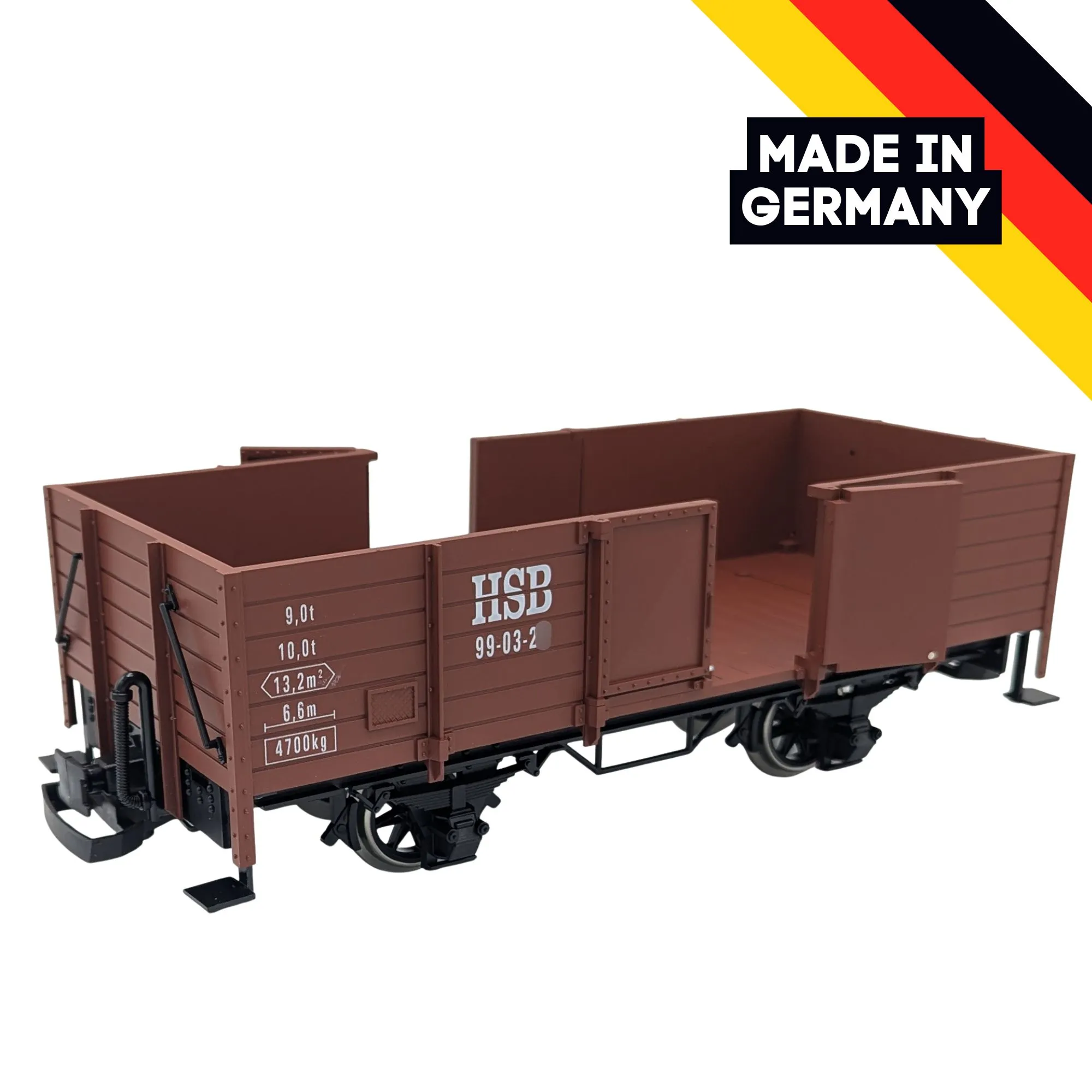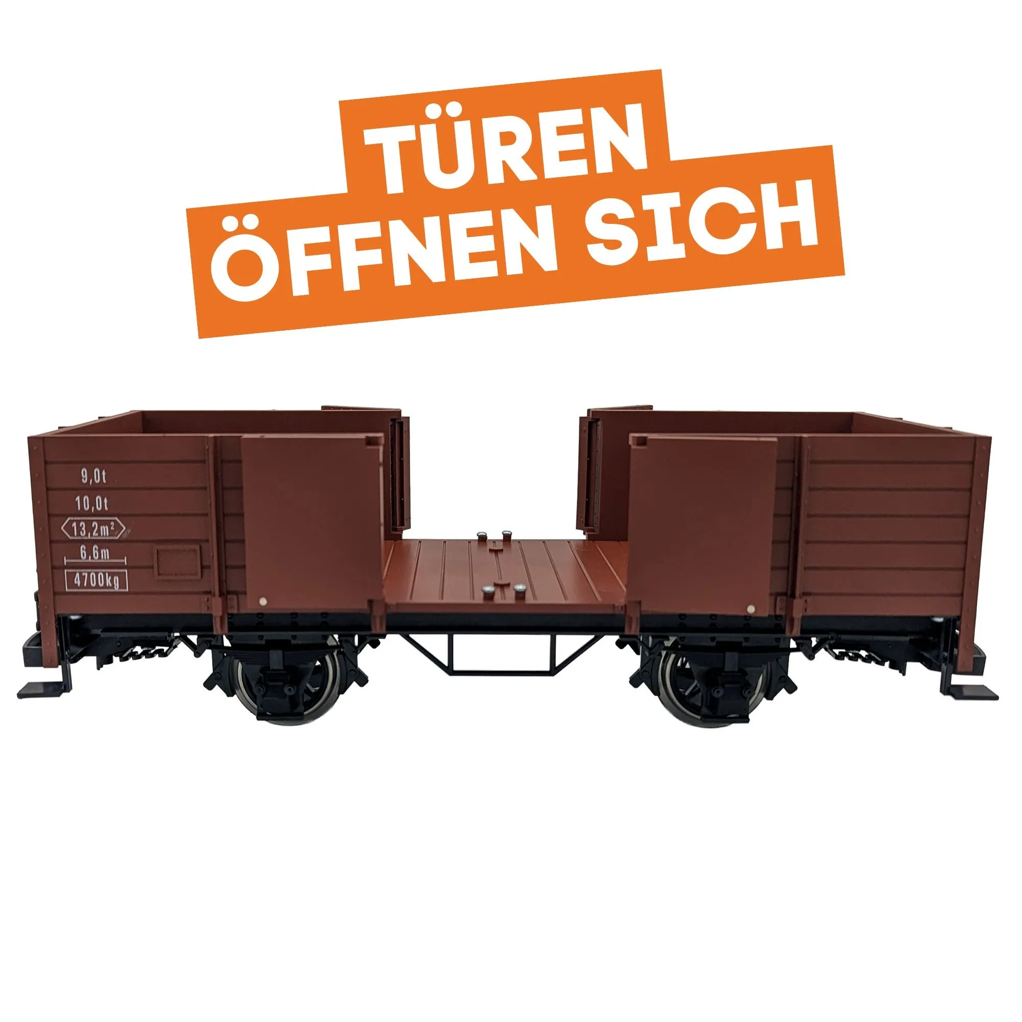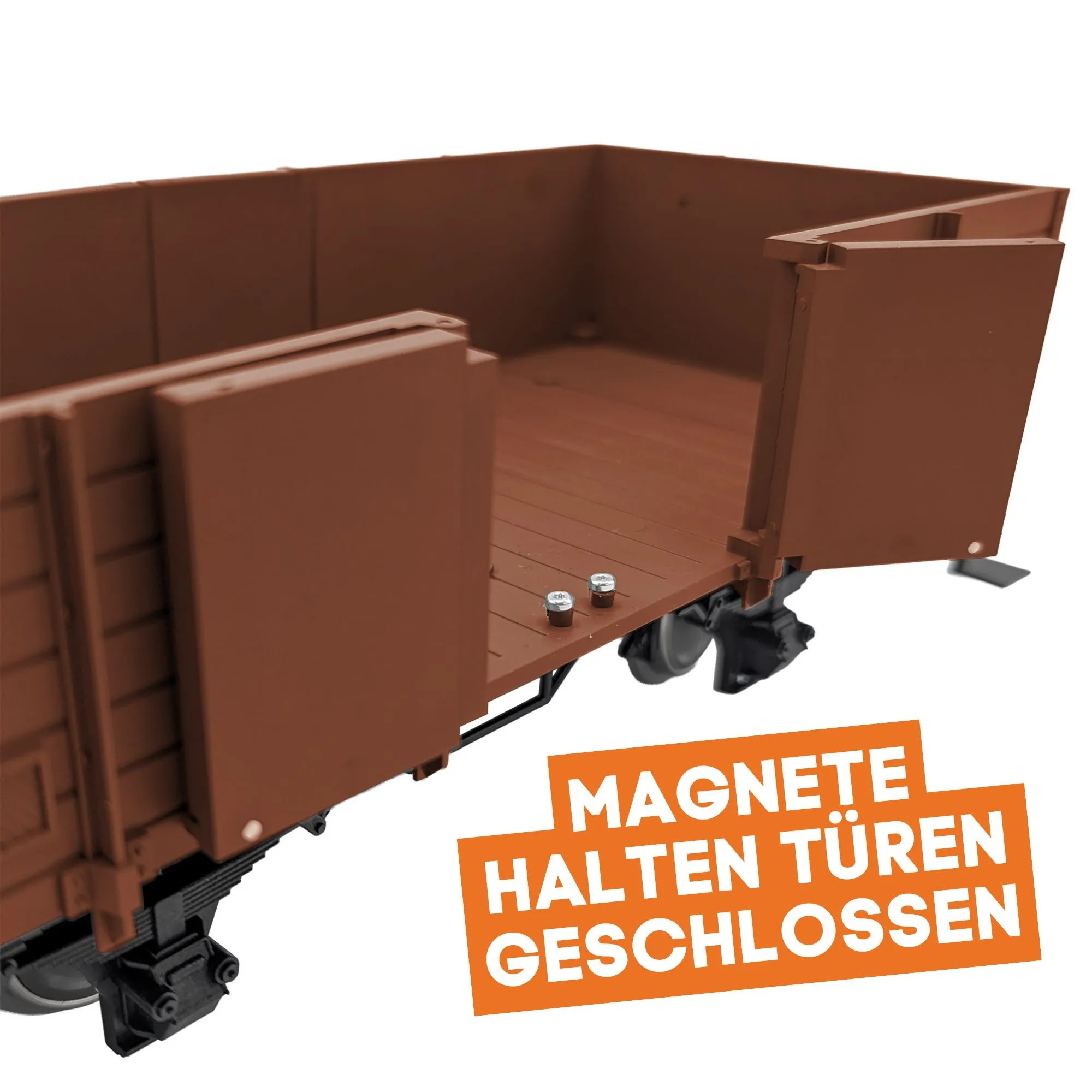 Die Türen lassen sich öffnen und machen Be- und Entladesituationen an Rampe, Ladestraße oder Anschlussgleis deutlich realistischer. Im geschlossenen Zustand hält ein Magnetverschluss sicher in Position, sodass der Wagen ordentlich wirkt und beim Fahren oder Rangieren kein ungewolltes Aufklappen entsteht.