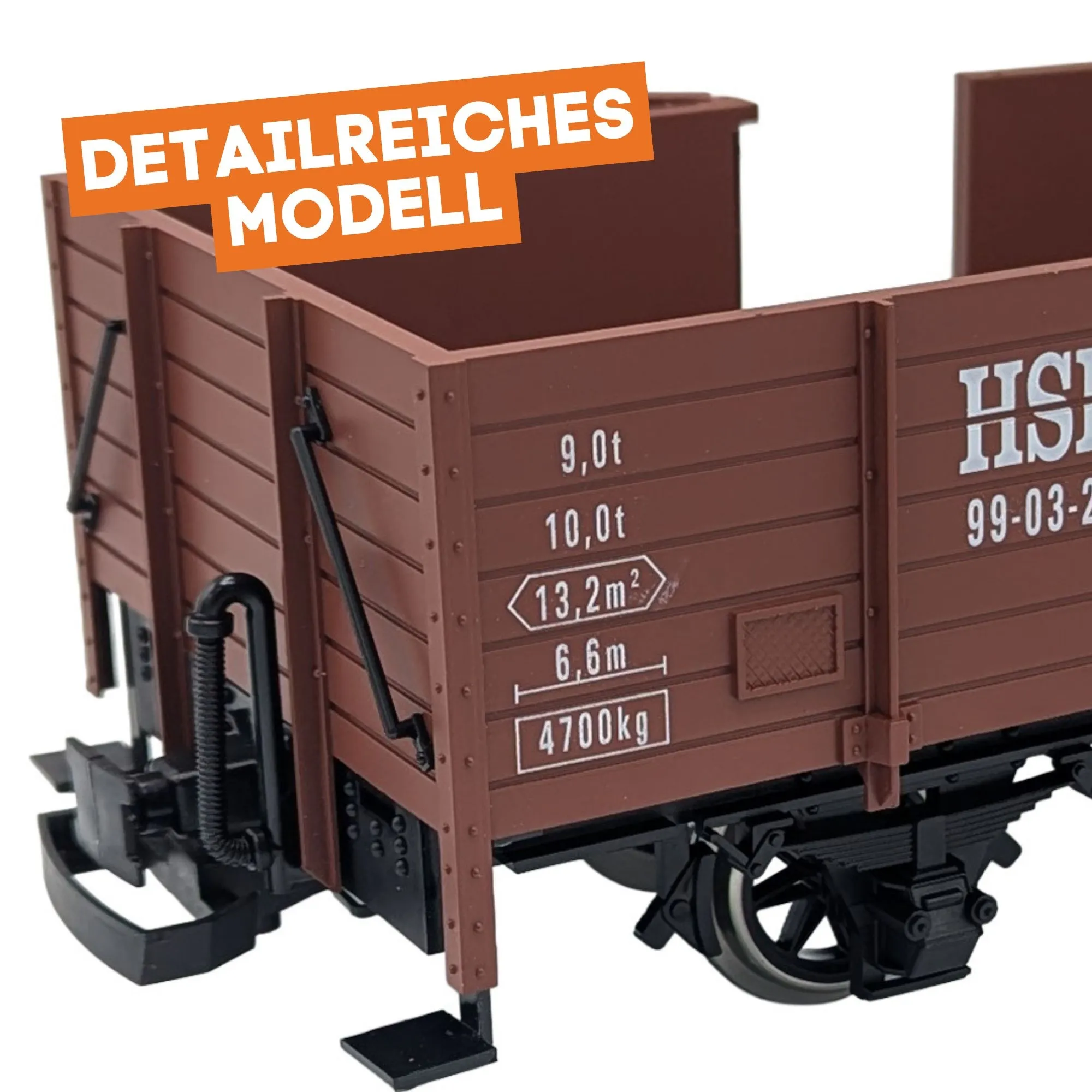 Die Türen können geöffnet werden und bringen mehr Funktion in Ladegleis- und Rampenszenen. Im geschlossenen Zustand sorgt der Magnetverschluss für sicheren Halt, damit der Wagen im Fahrbetrieb geschlossen bleibt und ein aufgeräumter Eindruck entsteht.