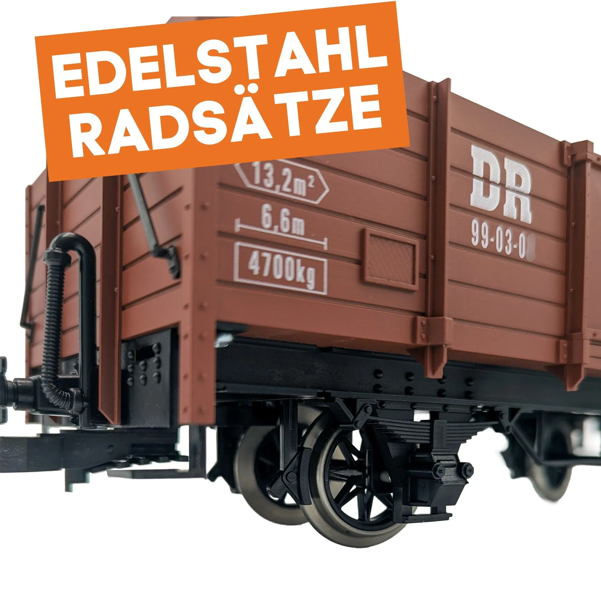 Edelstahl-Speichenradsätze unterstützen gleichmäßiges, ruhiges Laufverhalten und eine robuste Basis im Betrieb. Die angegebene R1-Tauglichkeit ermöglicht den Einsatz auf engen Radien; die Beipacktüte mit 2 Kupplungshaken und 2 Bolzen ist direkt mit dabei.