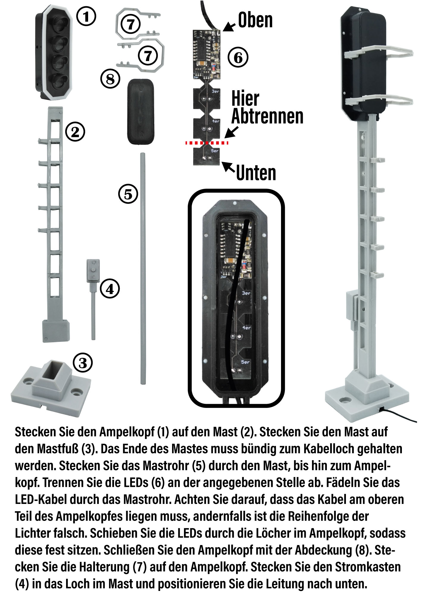 Das Mastrohr ist aus massivem, grau lackiertem Stahl gefertigt. Ergänzend bestehen Sockel, Mast, Stromkasten, Halterung und Signalkopf aus hochwertigem Kunststoff. Diese Bauweise macht das Signal langlebig und widerstandsfähig gegenüber Witterungseinflüssen, ohne optische Einbußen.