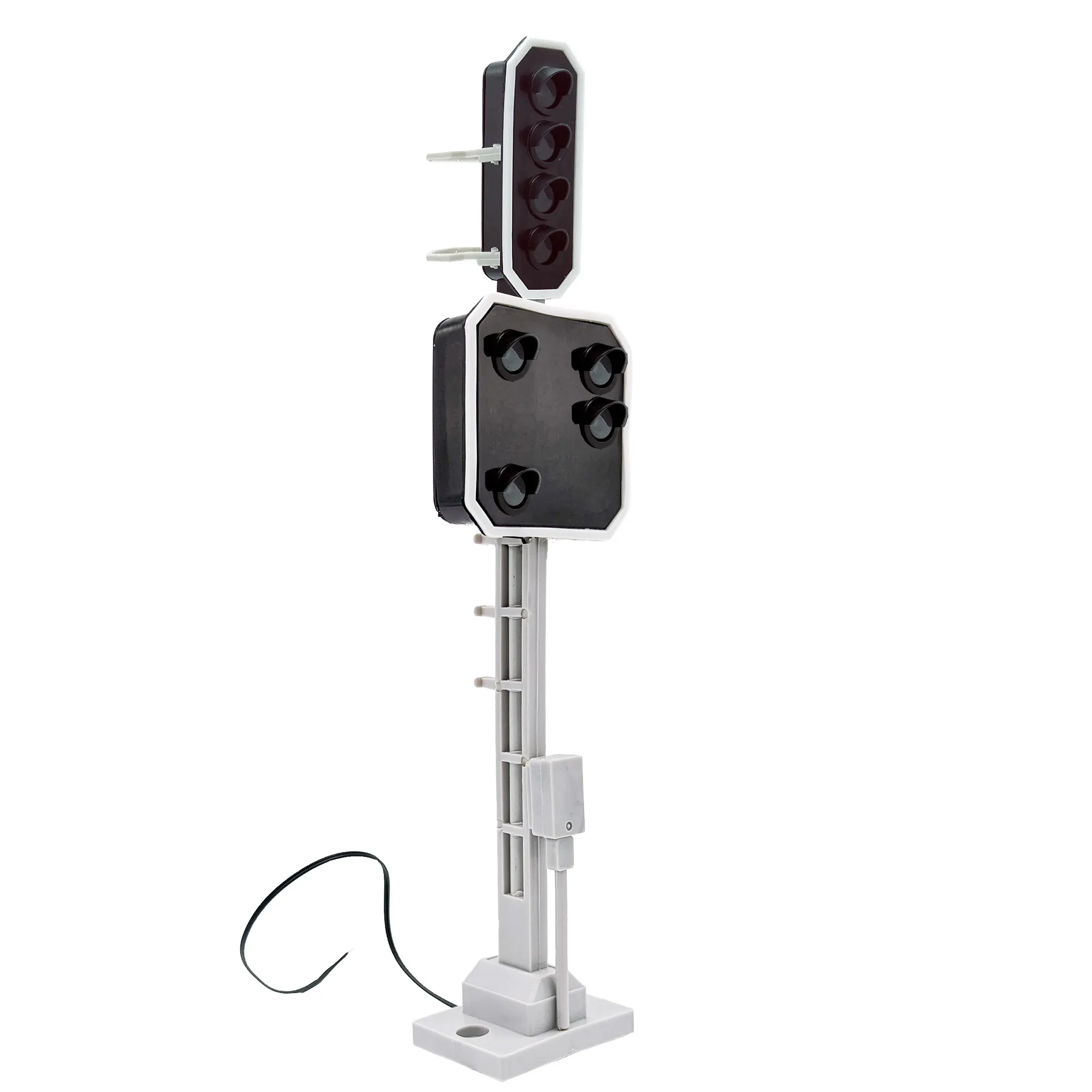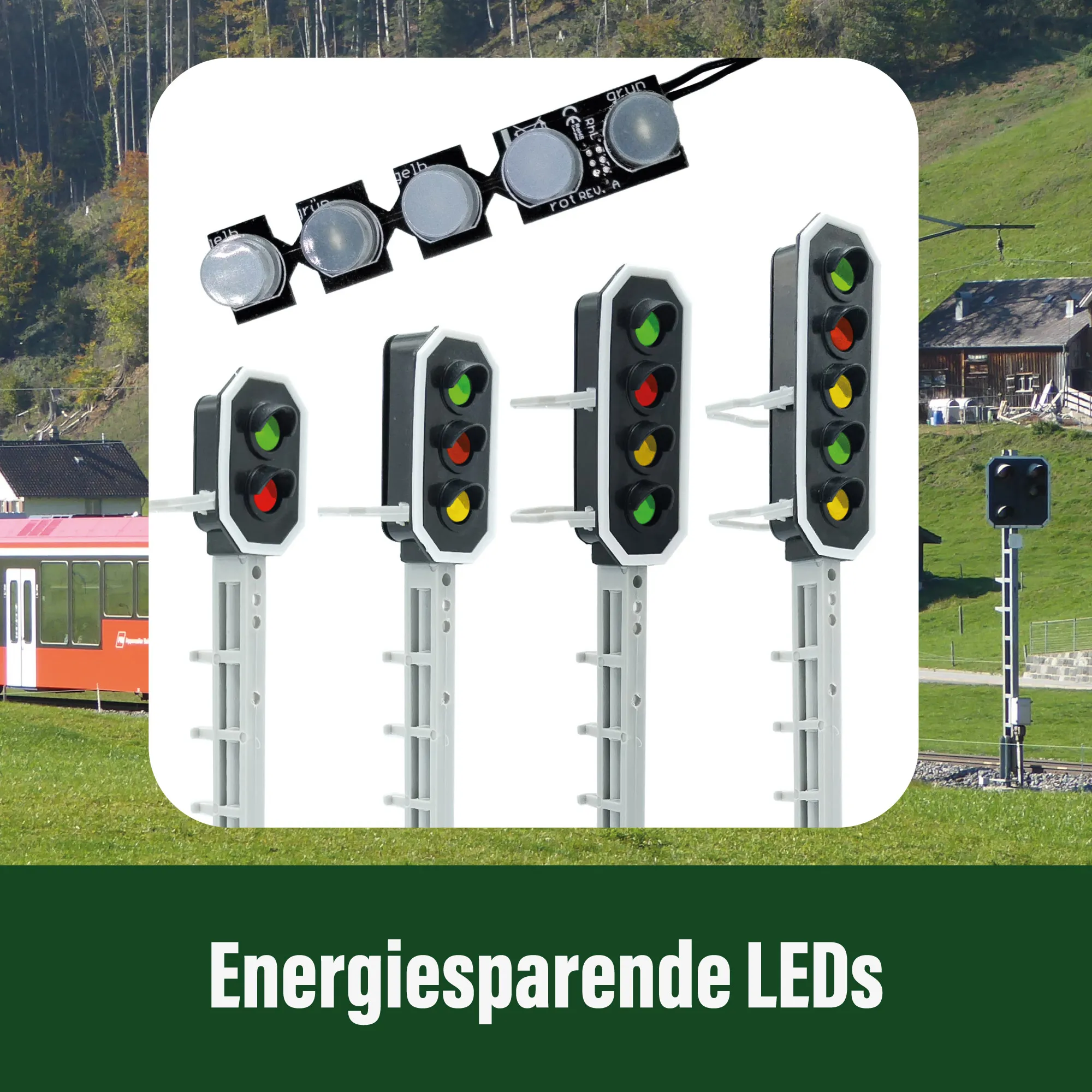Haupt- und Vorsignal in einem System für sechs Signalbilder. Synchronisierte Darstellung nach RhB-Vorbild, mit wetterfestem Aufbau und NMRA-DCC-kompatiblem Decoder.