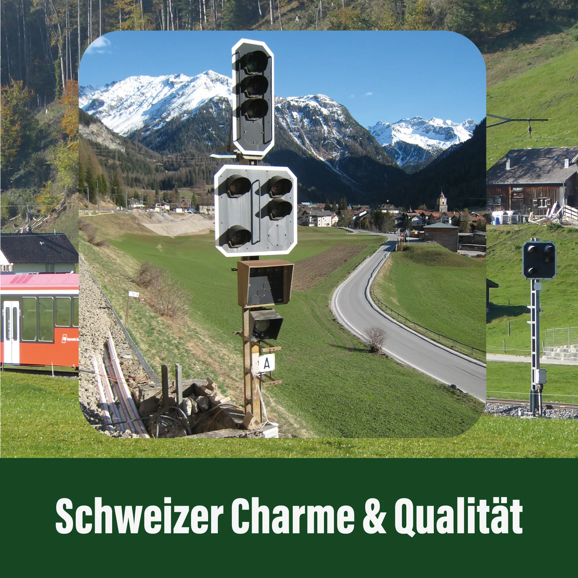 Vollausgestattetes RhB Signalsystem mit sieben Signalbildern und integriertem Vorsignal. Geeignet für komplexe Streckensteuerung im digitalen und analogen Modus.