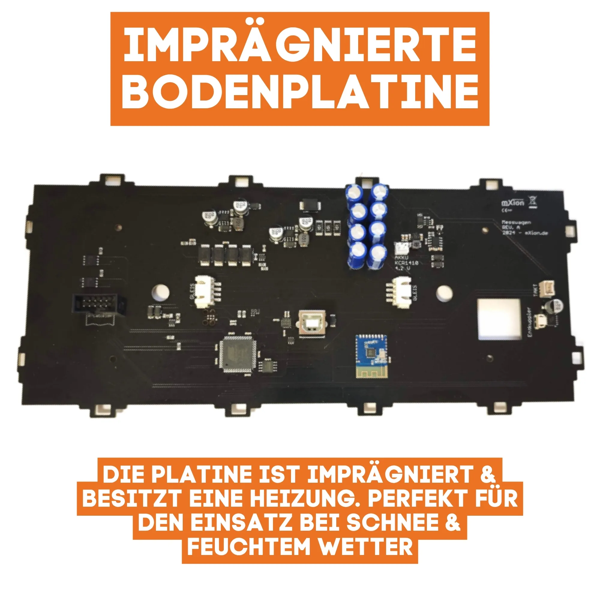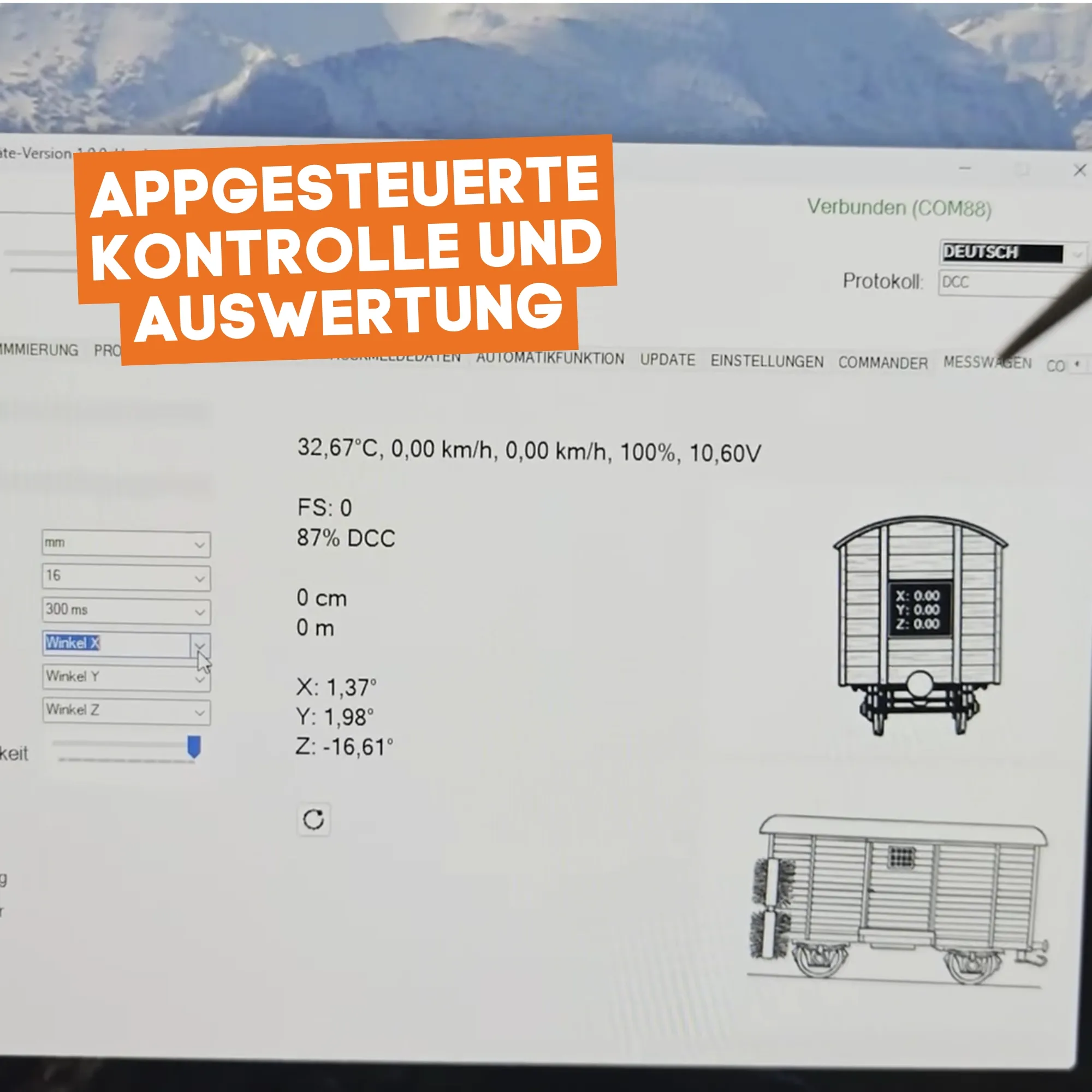Messfunktion im FokusEine integrierte Elektronik-Platine ersetzt die Bodenplatte und macht den Wagen zum mobilen Messlabor. Ein leistungsfähiger Prozessor verarbeitet in Echtzeit die Signale von Taktsensor und 3-Achs-Gyroskop; so entstehen exakte Angaben zu Geschwindigkeit (real und modellskaliert), Neigung und Lageänderungen. Gleichzeitig überwacht die Bordelektronik die anliegende Spannung und stellt die Werte unmittelbar am Front-OLED dar. Das ermöglicht gezieltes Einmessen neuer Abschnitte, das Auffinden von Kontaktproblemen und die objektive Bewertung von Steigungen, Übergängen und Kurven – während der Fahrt und ohne Zusatzgeräte.