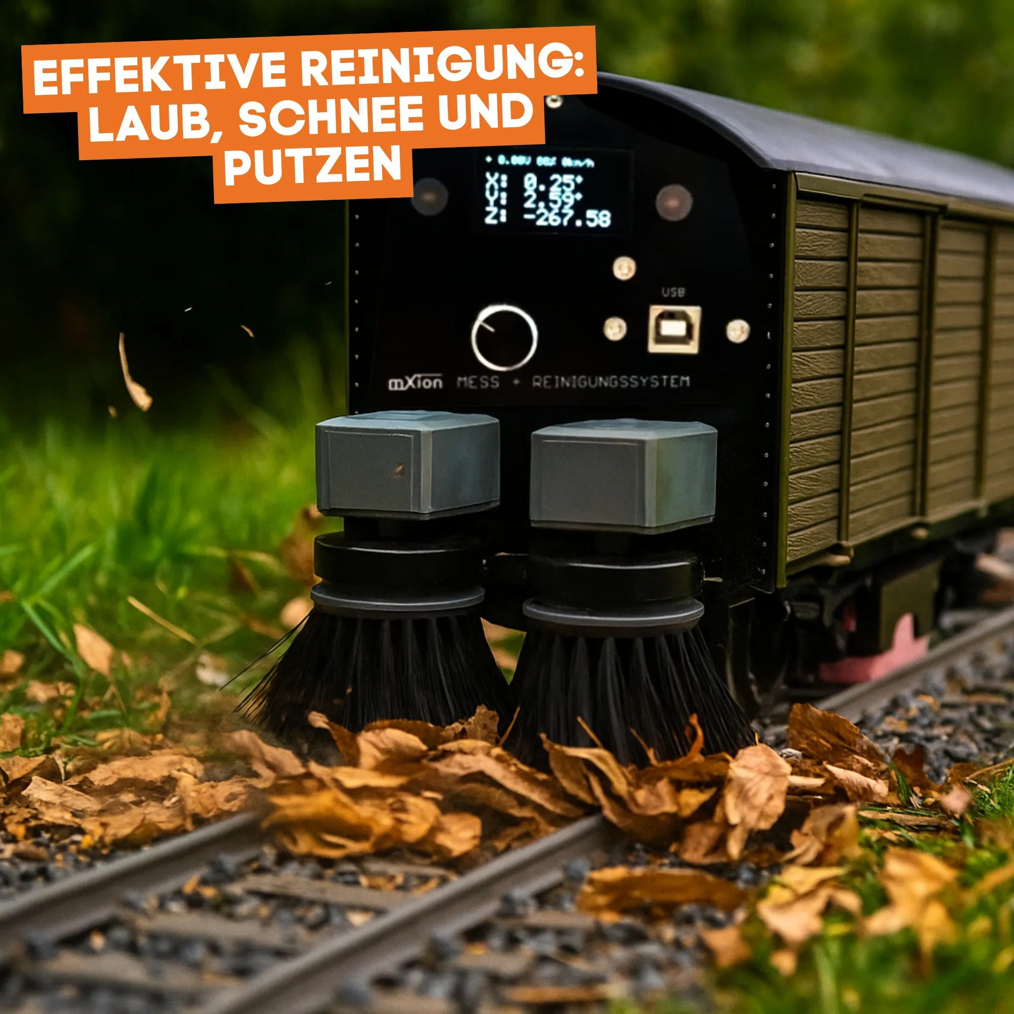 Einsatz & SteuerungVorn räumen zwei rotierende Bürsten Schnee, Laub und groben Schmutz; unten pflegt ein Schwammreiniger die Schienenoberflächen schonend nach. Kugelgelagerte Achsen mit Stromabnahme sichern leichten Lauf und stabile Energieübertragung, sodass Reinigung und Messung kontinuierlich stattfinden – der braune Wagen fügt sich dabei harmonisch in Güterzüge ein.