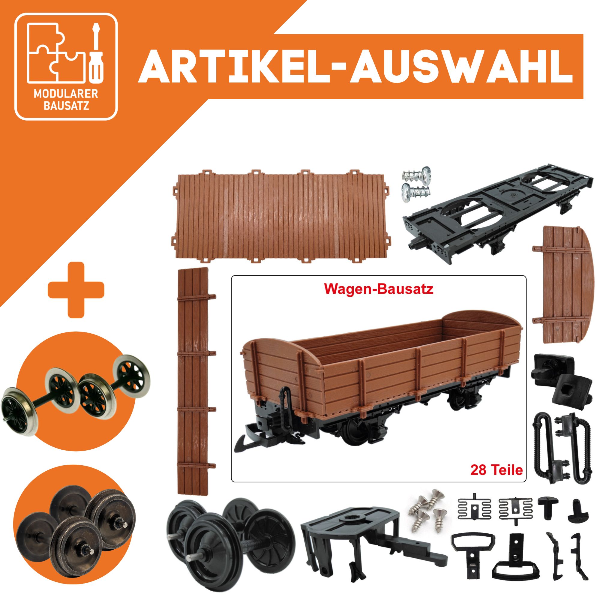 Der Niederbordwagen in Braun wird als präziser Spur-G Bausatz geliefert. Verwindungsarmer Rahmen, niedrige Bordwände und passgenaue Steck-/Schraubverbindungen ergeben einen stabilen Wagen mit gleichmäßigen Laufeigenschaften. Die modulare Ausführung unterstützt Umbauten und Pflege über lange Einsatzzeiträume hinweg.