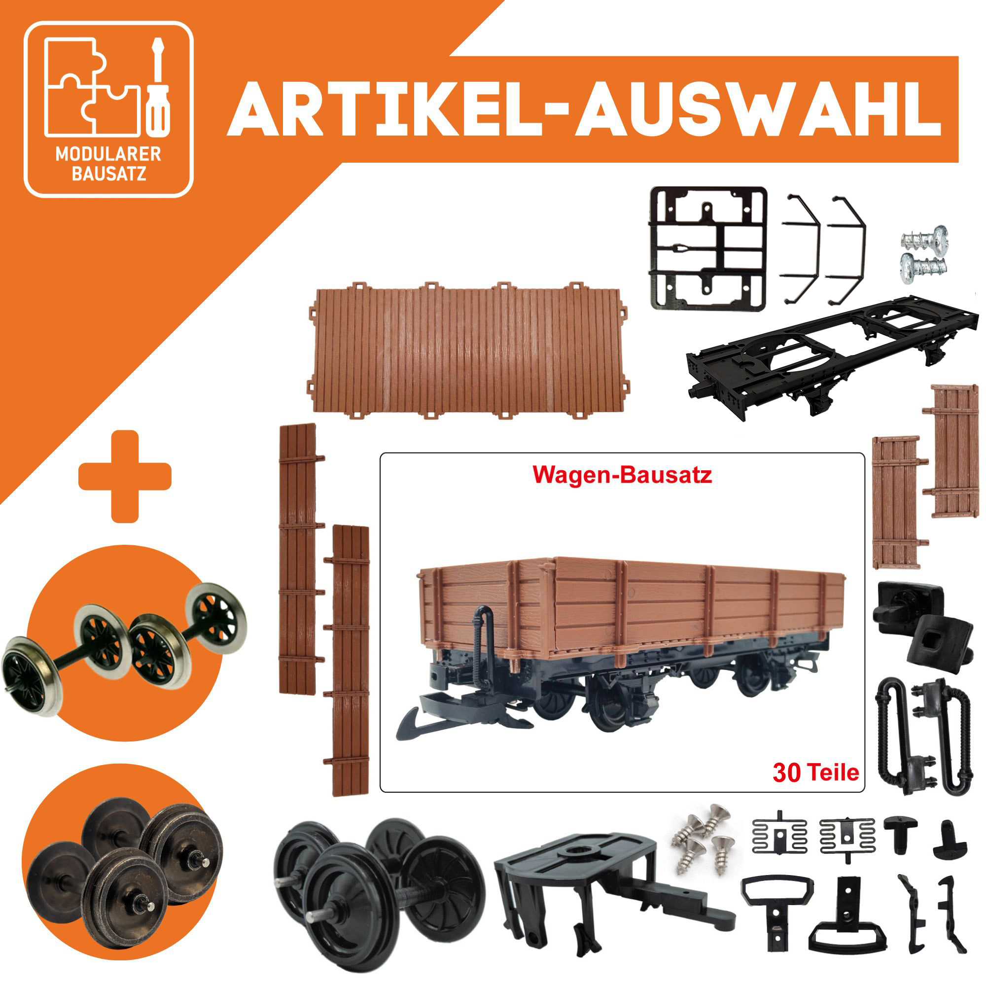 Der Niederbordwagen gerade in Braun wird als Spur-G Bausatz geliefert. Verwindungsarmer Rahmen, geradlinige Niederbordseiten und passgenaue Steck-/Schraubverbindungen sorgen für zügige Montage, stabile Verbindungen und gleichmäßiges Rollverhalten im dauerhaften Anlagenbetrieb.