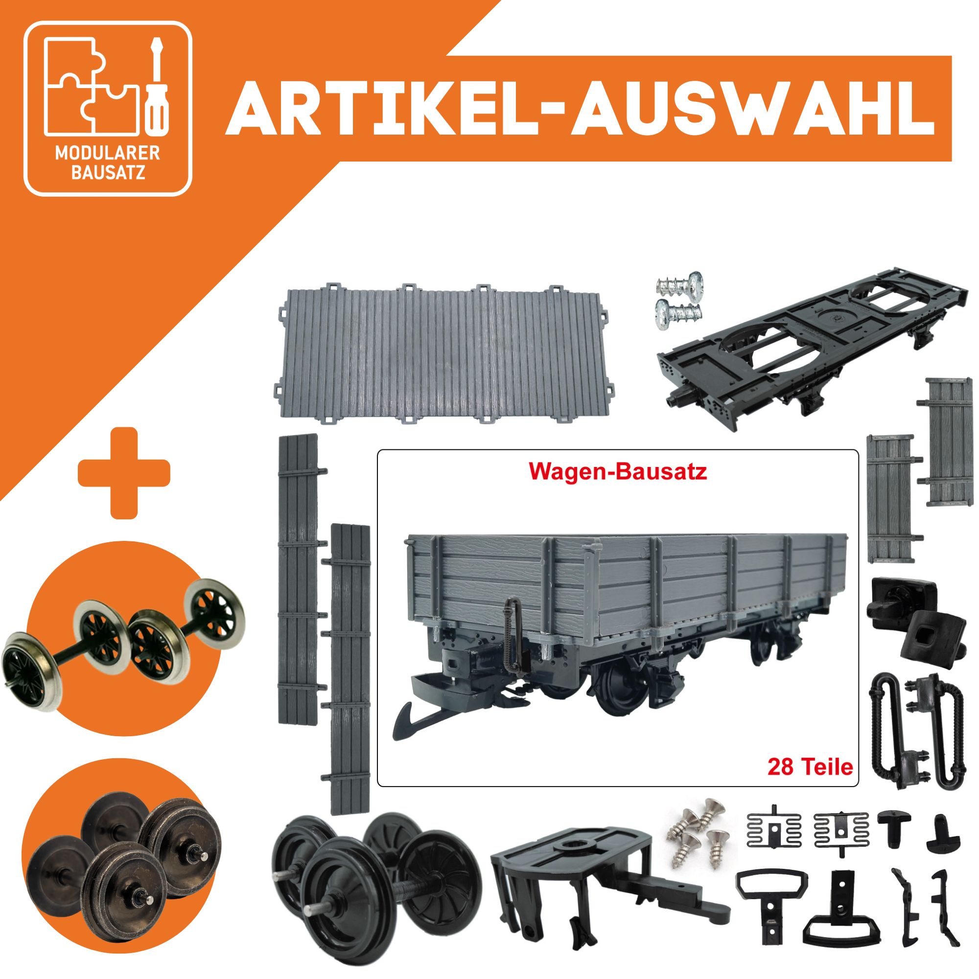 Niederbordwagen gerade in Grau als Spur-G Bausatz mit stabilem Rahmen, modularer Ausführung und Varianten mit unterschiedlichen Radsätzen.