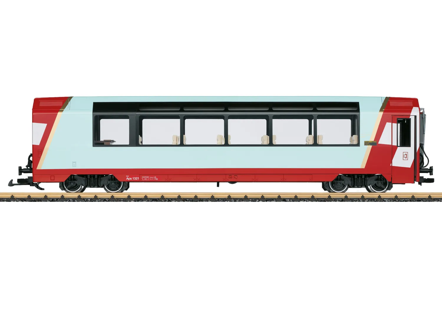 Der Panoramawagen 1. Klasse RhB LGB 33670 ist ein Modell der Excellence Class der Rhätischen Bahn für den Glacier Express, originalgetreu in Farbgebung und Beschriftung der Epoche VI, mit vollständiger Inneneinrichtung und Innenbeleuchtung.