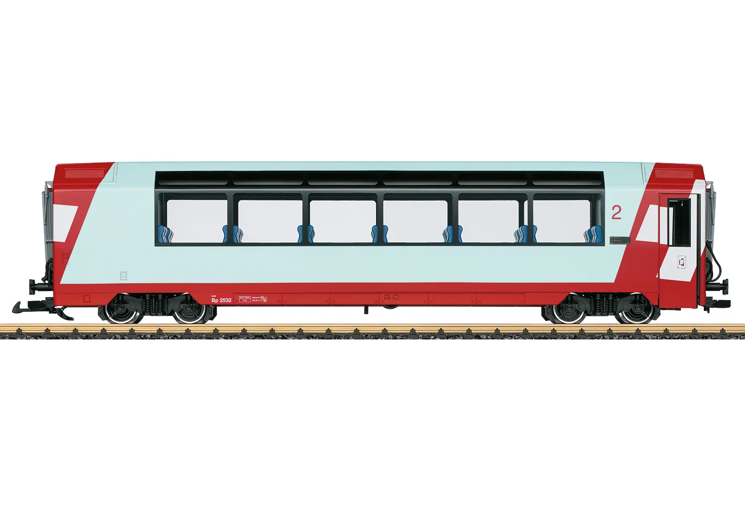 Der Panoramawagen 2. Klasse RhB LGB 33671 ist ein originalgetreu gestaltetes Modell der Rhätischen Bahn für den Glacier Express, mit vollständiger Inneneinrichtung und Innenbeleuchtung.