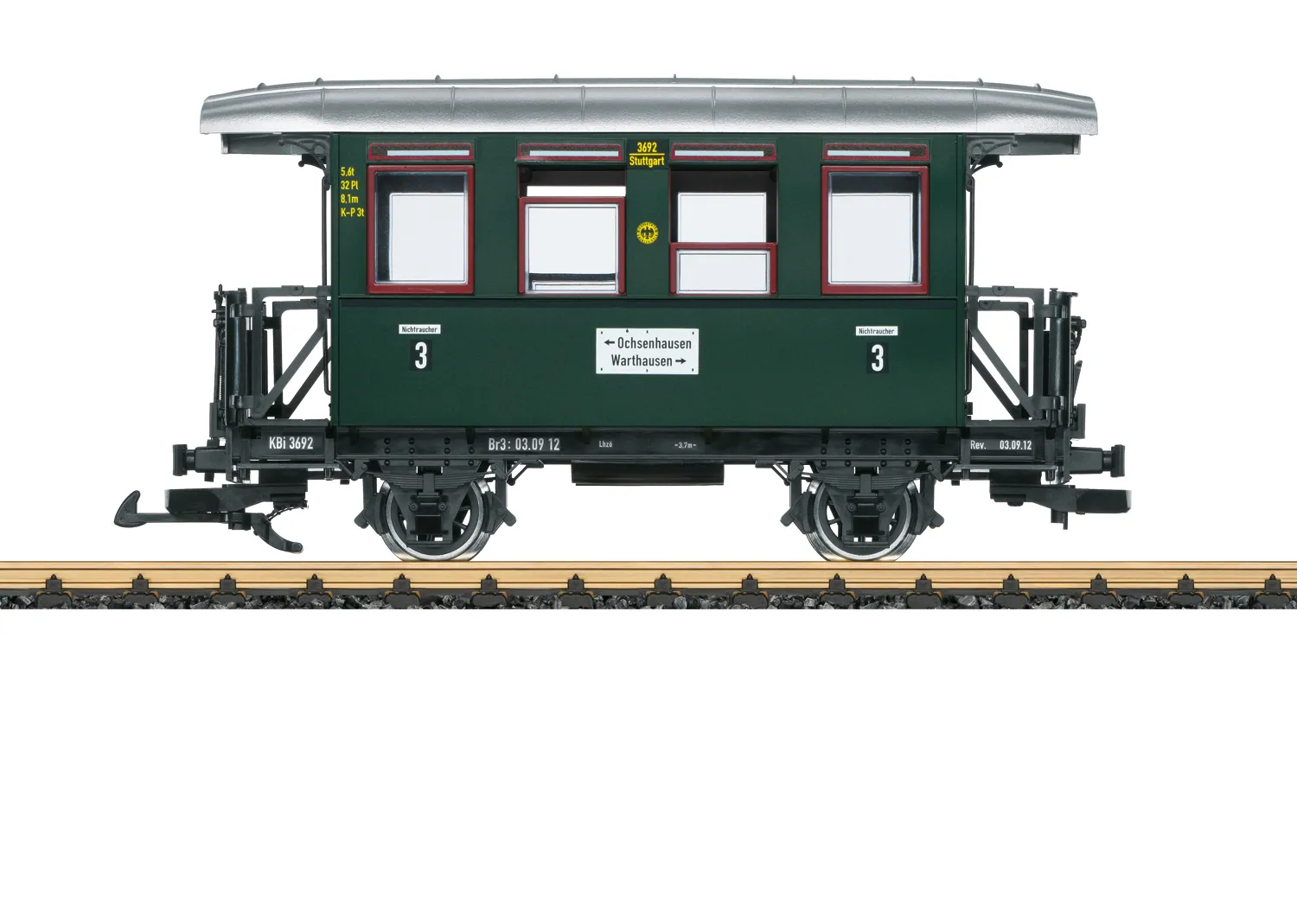 Dieser 2-achsige Personenwagen der Öchsle-Museumsbahn, der noch heute in Oberschwaben im Einsatz ist, besticht durch seine originalgetreue Farbgebung und Beschriftung der Epoche VI. Die Türen sind funktional und lassen sich öffnen. Die Länge über Puffer beträgt 30 cm.