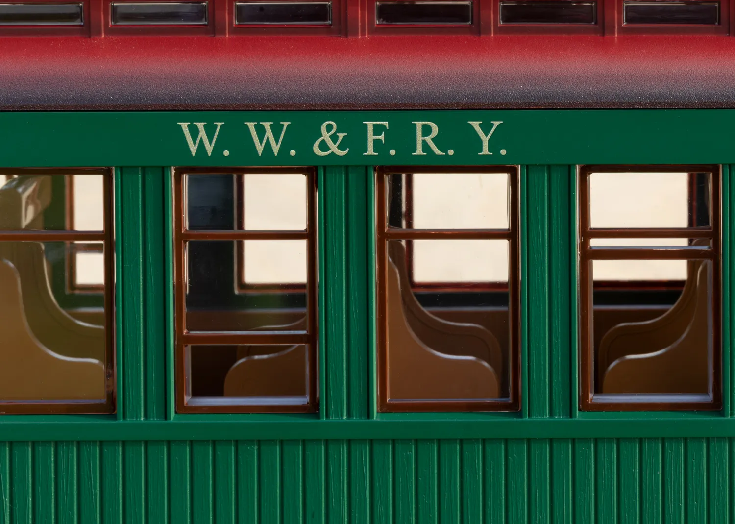 Bei den auf der Wiscasset, Waterville und Farmington Railway verkehrenden Museumszügen werden die typischen amerikanischen Oldtimerwagen eingesetzt, erkennbar an dem Oberlichtaufsatz in der Mitte des Wagendachs. Bei den kleinen dort eingesetzten Loks sind meistens nur 2 bis 3 Wagen zu einem Zug zusammengekuppelt, auch sind gemischte Züge aus Personenwagen und Güterwagen üblich. Mit der dunkelgrünen Farbgebung entsprechen die Wagen einem weit verbreiteten Anstrichsschema, was unter anderem auch bei Fahrzeugen der Durango & Silverton Railroad oder der White Pass & Yukon Railroad verwendet wird.