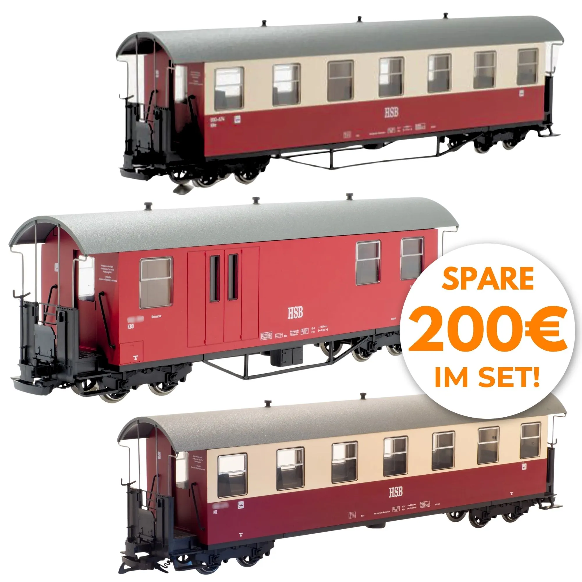 Zwei HSB-Personenwagen plus Packwagen: stimmige Detaillierung, vorbildgerechte Maße und robuste Ausführung – ideal kombinierbar zur authentischen HSB-Zugbildung.