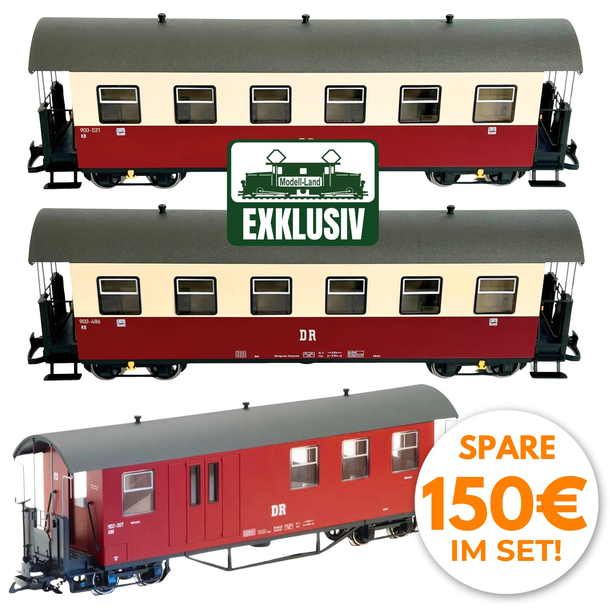DR Dreiwagen-Set Spur G: Personenwagen 900-521 & 900-486 (je 6 Klappfenster) plus Packwagen 902-307. Neue Wagenkastenform, ca. 53 cm LüP, Zubehörbeutel – detailreich und betriebstauglich.