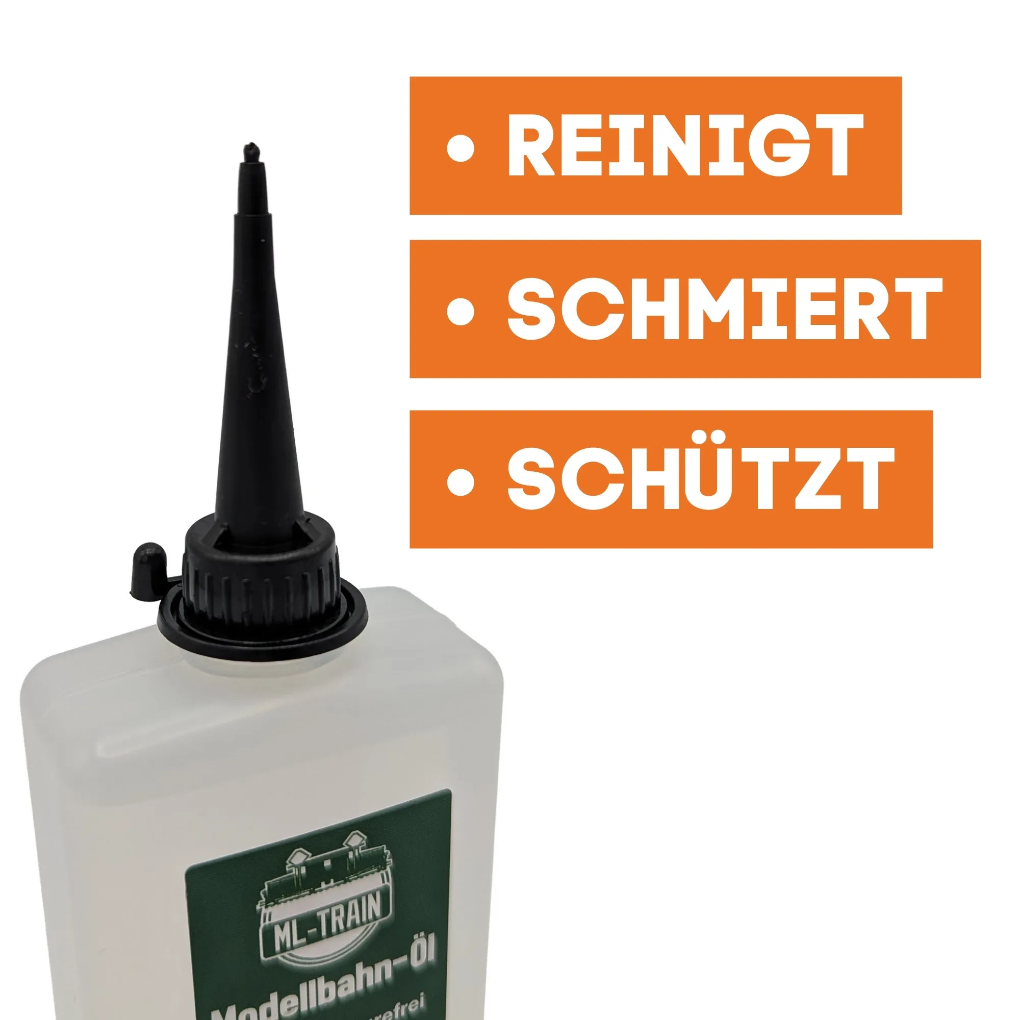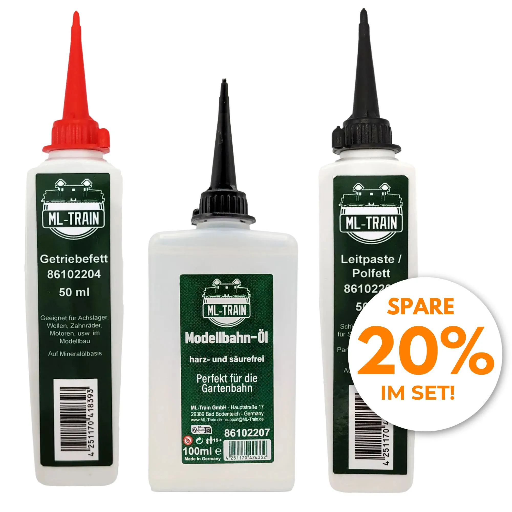 Das ML-Train Pflege- und Schmiermittel-Set kombiniert drei hochwertige Produkte, die speziell für die Anforderungen von Modellbahn und Gartenbahn entwickelt wurden. Es umfasst das vollsynthetische Modellbahn-Öl (100 ml), die Leitpaste/Polfett (50 ml) sowie das Getriebefett (50 ml) und bietet damit ein Komplettpaket für zuverlässige Pflege, Schmierung und Schutz.