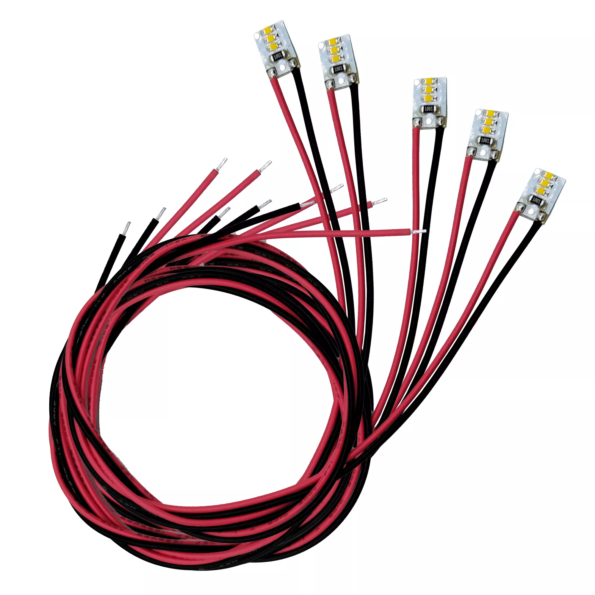 Fünf LED-Platinen mit je drei warmweißen Dioden und 60 cm Anschlusskabel ermöglichen die Versorgung mehrerer Beleuchtungspunkte in einem Schritt. So können Sie größere Anlagenbereiche gleichmäßig ausleuchten, ohne jede Platine einzeln verdrahten zu müssen.
